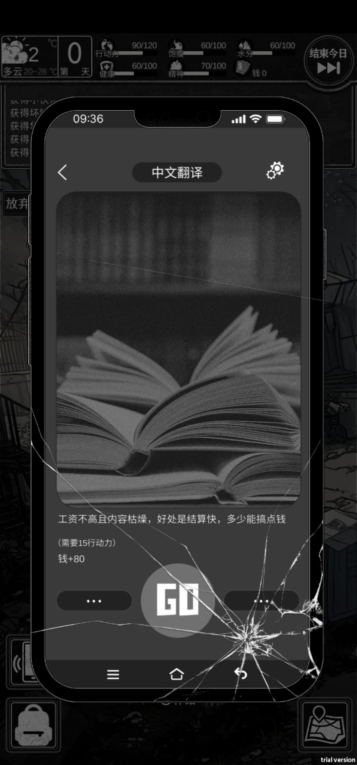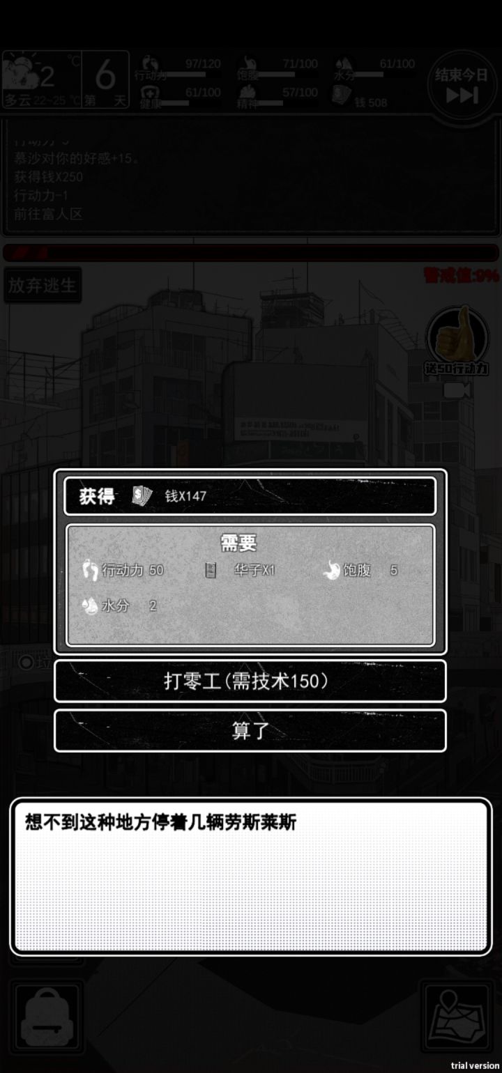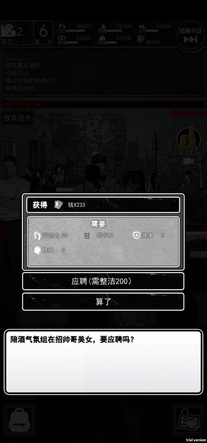 第一局的时候非常善良的,直接把信息泄露给晨晨了。死第二局的时候,因为和晨晨有关系,和斌哥聊着聊着聊崩了。死第三局的时候,避雷晨晨,完全没和她说过一句话,只差一天就能攒够钱了。死第四局的时候,突然意识到一个很严肃的问题叫做,无论是去看场地还是去打灰,还是去做酒保,还是去修车,都不如我翻译挣钱快。15行动力换80元。而在富人区的事情都要花50行动力去挣不到200(因为当时不知道给的价格是属性不足