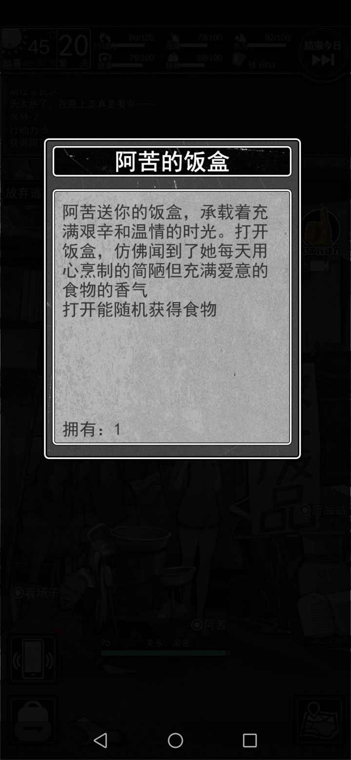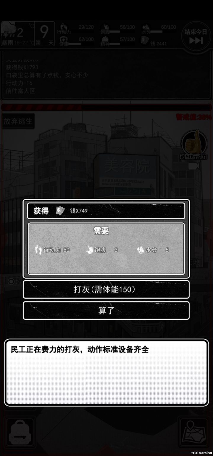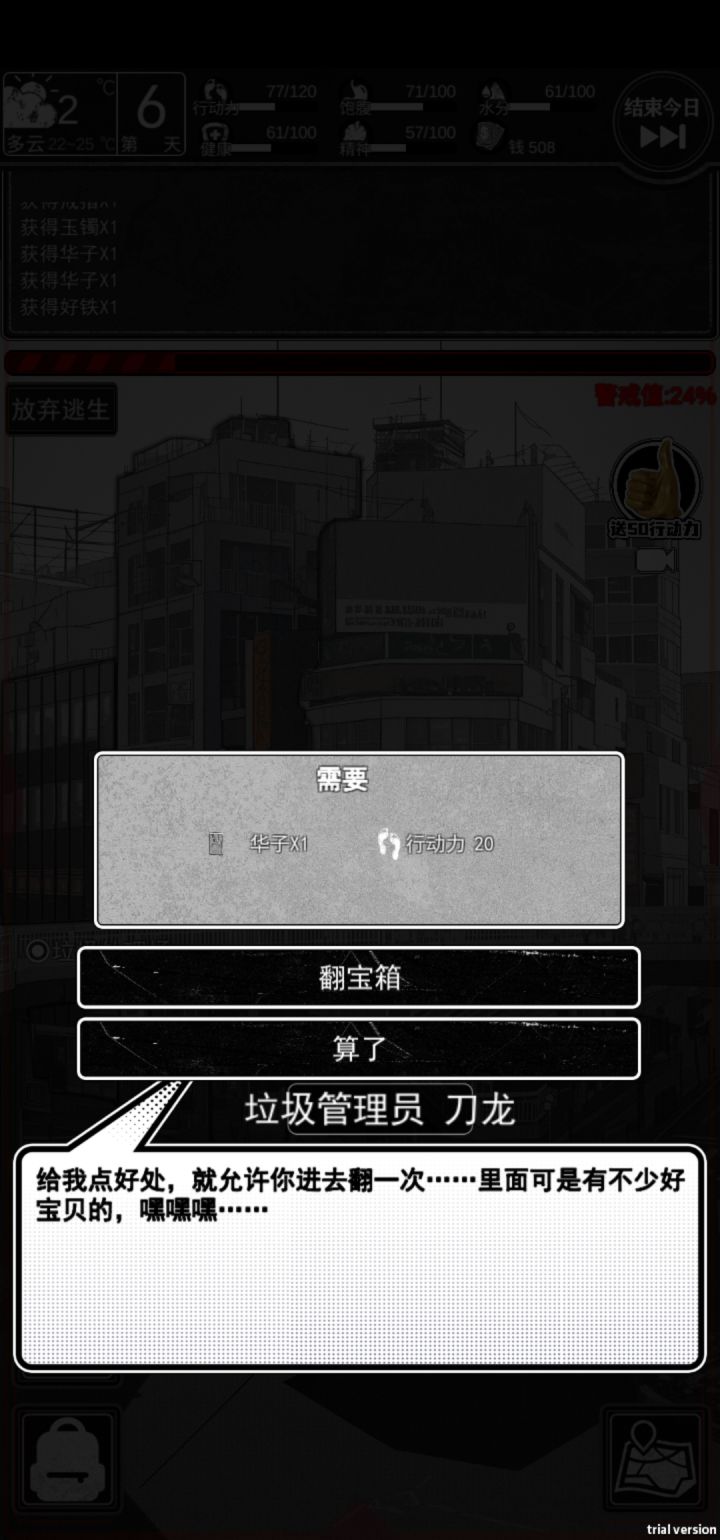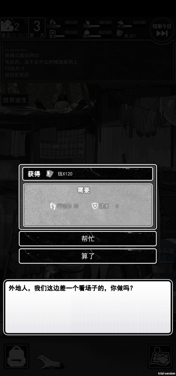 游玩之后总结的经验,仅供大家参考。我按照地图,把每个地区做了说明。家:垃圾桶捡东西会消耗十个行动力,不过有时候捡到的东西能卖几百,建议每天都抽,如果出了华子没抽到,一定要广告拿下,华子原价可是200一盒!另外,后期其他地方也会刷垃圾桶,别捡,不值。黑商每天也要看一下,有时候打折,价格比小卖部还低,甚至有一块钱的华子,另外,个人建议如果只贵一两块钱,尽量全款拿下,前期先把饱腹,水分,精神,健康,