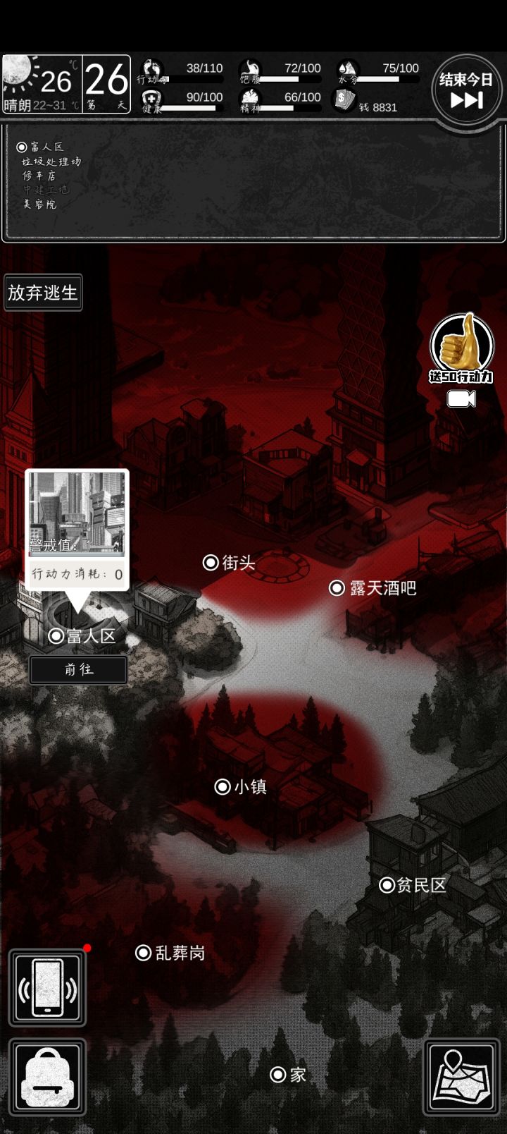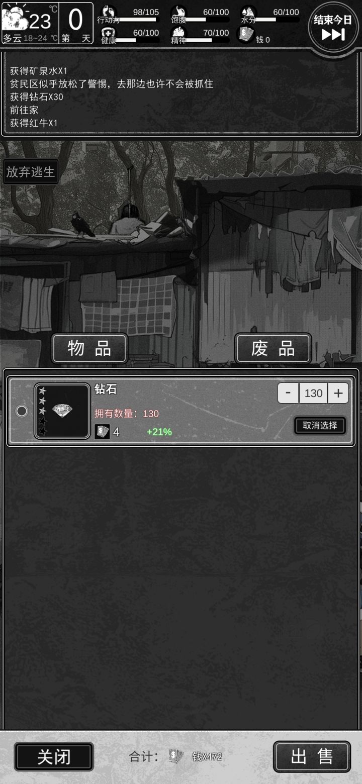 天赋刷月卡党,100钻加每天30总共970钻,只要价格高于11卖出去970×11=10670,直接凑齐一万,钻石可以在黑市商人那里买保险箱避免被偷休息给少体力的是45体,多体力是55体,自行衡量,尽量避免多地图来回切换浪费体力,前期能省就省,不要手机和卖废品那里打工赚钱垃圾桶捡的华子不要卖,留着后期打工用和开宝箱,其他一律卖掉,尽量不要屯在手里被偷前期在体能和技术里面二选一,手机里面可以学起