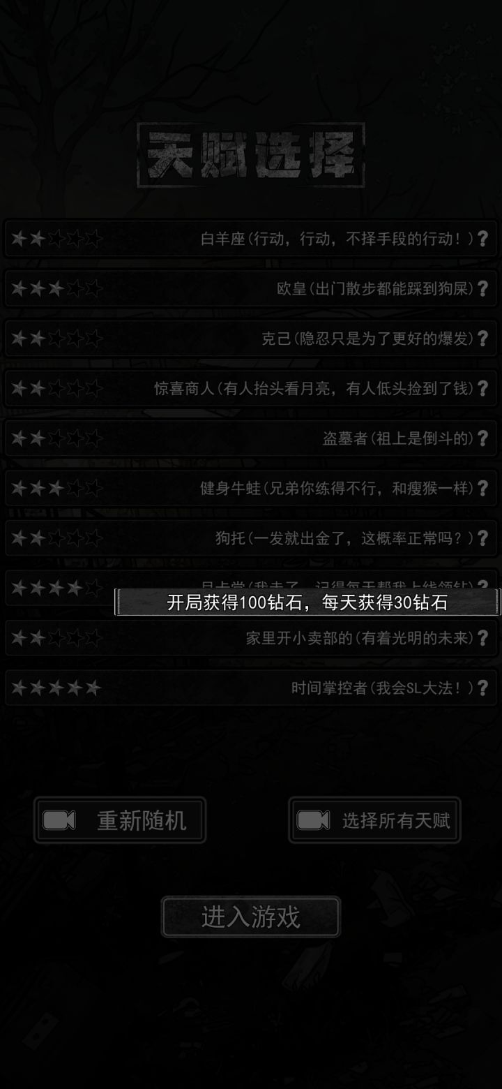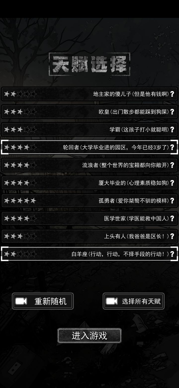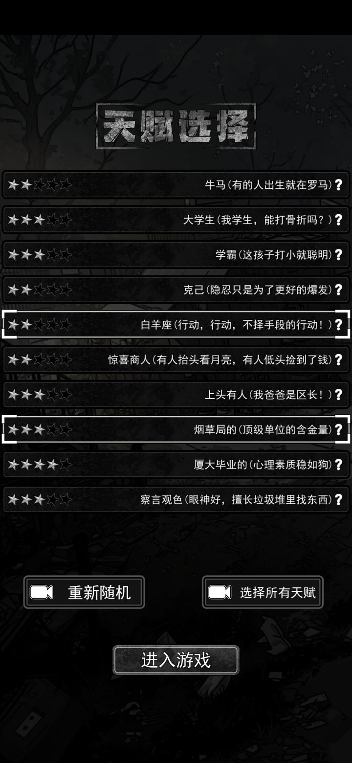 五星真不一定是好天赋,更喜欢带这三个白羊座:每天行动力额外恢复10点,天赋上限只是上限,每天恢复根本满不了,但是配上白羊座和持续充沛,那行动力简直了,要知道打工有限制,但翻译是没有的啊!也就是,行动力就是钱啊!烟草局:开局自带5个华子,配上属性宝藏之眼,每次都会翻出华子,相当于白送手镯手表等名贵物品,刀龙是绝对的好人啊!轮回者:保留这一局最高属性的30%到下一局。没有轮回者的打工不是工,学