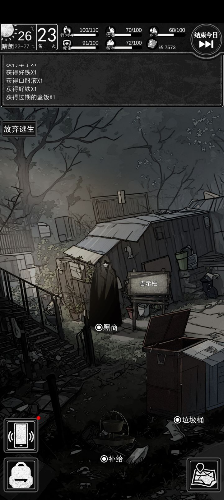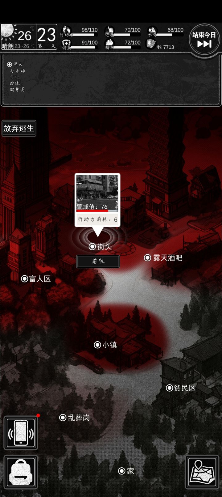 结束一天的时候有三个选择:搜寻物资/睡觉/守卫遭窃概率少于或等于10%时不会遭窃,哪怕大于11%也可能遭窃。遭窃会被偷走物品和钱。买保险箱只能使用一次,且只能存一个物品,并且不是一买完就出现。买了保险箱虽然被存物品不会丢,但也会丢钱。(建议别买,选守卫什么都不会丢)警戒值少于54%时不会被抓(至少我玩好几次了都没被抓过)买东西或干其他什么的都会涨警戒值(大部分时候,除了警戒值为0那两天)