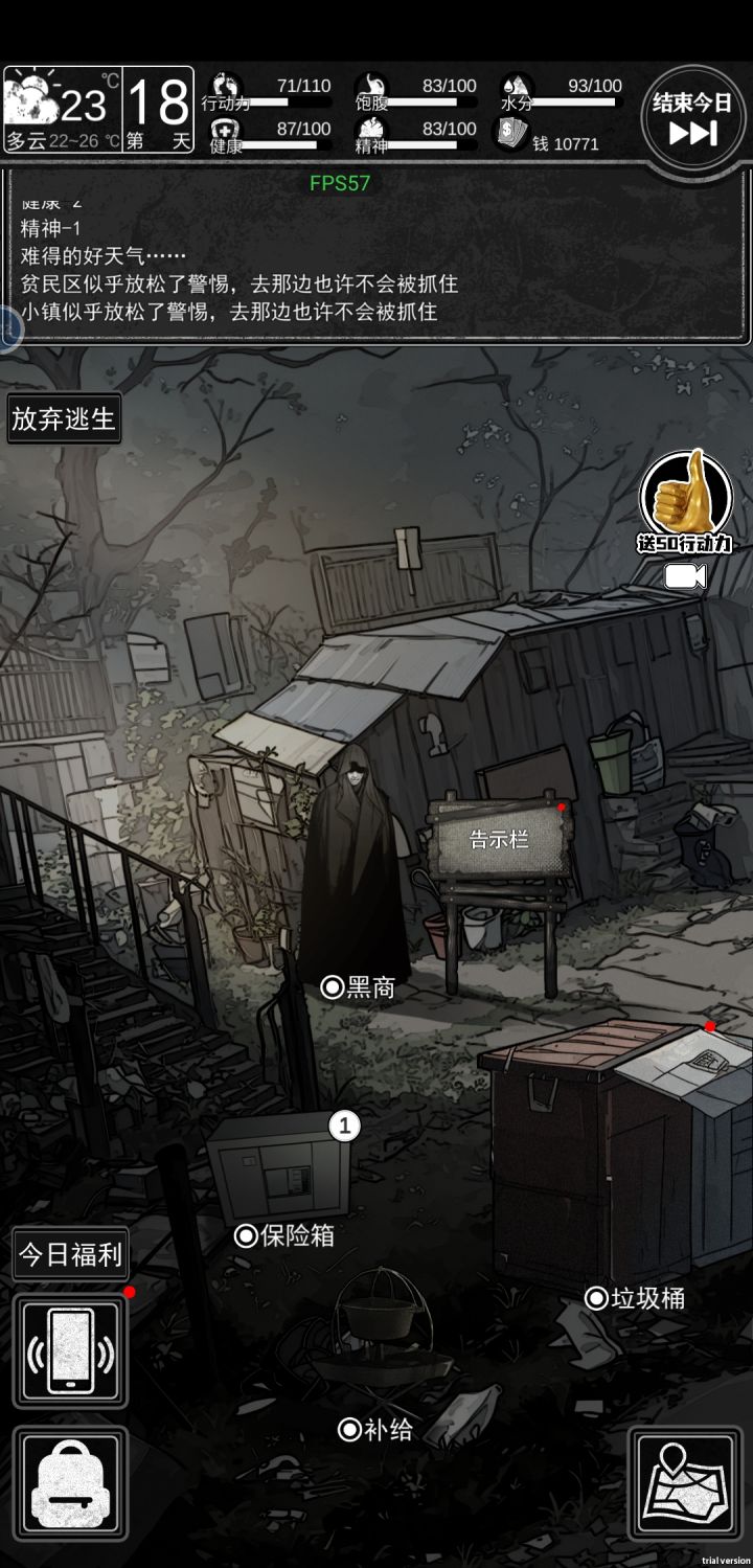 浅浅的试玩了几局,有一些问题1.天赋不够详细 有时候选了相同属性的天赋 2.背景音乐不知道怎么关3.正常新手过20天没问题,但是最后的30天7000元难度较大,而且后期除了家和贫民其它地方危险性都很高,难度有点大。可玩性和灵活性感觉可以再优化一下