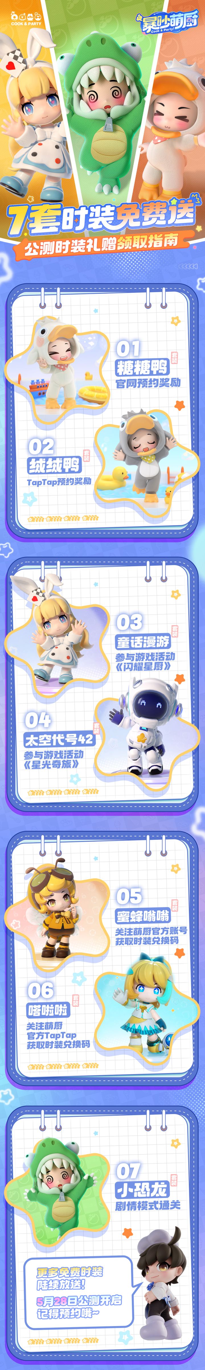 时装不断送送送送到厌倦欢乐厨房派对手游《暴吵萌厨》5月28日全平台公测开服,7套公测免费活动时装大盘点料理师们速速滑动笔记图片,查看获取方式!即刻预约《暴吵萌厨》手游,5月28日出发料理王国游戏内还有更多免费外观等你游玩获取,穿出你的主厨个性OOTD哦!#暴吵萌厨 #新游安利
