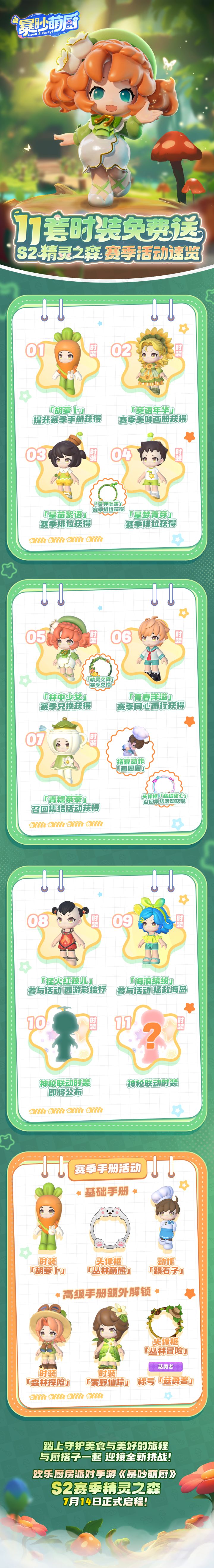 暴吵萌厨精灵之森 新赛季7月14日即将上线~小厨浅算了一下,暴吵萌厨S2赛季【至少】有【11套免费时装】可获取!6套赛季免费套装➕3套活动套装➕2套未公开联动套装,等大家揭开惊喜~在S2赛季中,我们将特别新增料理师召回集结活动,不管是召唤旧友回归或是邀请新的朋友加入料理王国,都可获得全新时装、趣味结算动作等一波好礼。🌈即刻下载游戏,踏入料理王国,跟着小厨一起解锁满满福利,在热闹的美食冒险中
