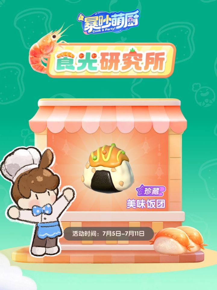 7月5日起,进入游戏内活动页面参与【食光研究所】,通过完成每日任务及成就任务解锁阶段好礼,获得稀有头饰【暖暖太阳蛋】及珍藏背饰【美味饭团】!#暴吵萌厨