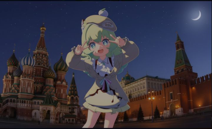 墨蓝色的夜幕笼罩莫斯科的红场,圣瓦西里大教堂的洋葱头穹顶在夜色里晕着斑斓的光泽,克里姆林宫的红墙与尖塔勾勒出冷峻又华丽的轮廓,一弯细月悬在缀满星子的天空,为这座城市添了几分温柔。绿发少女莫奈站在广场上,双手比出俏皮的剪刀手,眼眸亮得像揉碎了星光,嘴角扬起的笑意融化了莫斯科的凛冽。 身为感性的艺术家,她带着对世界的浪漫感知闯入这座北国之城,色盲的视觉让她眼中的红墙与穹顶,晕染出独属于自己的奇幻