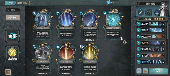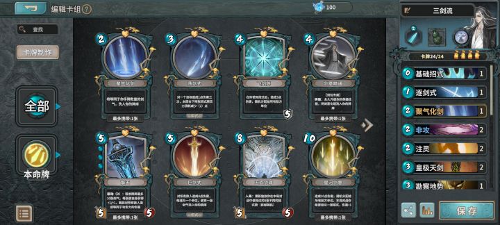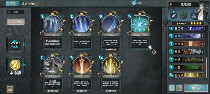 #上古河图 #游戏日常 #浅评一下 #游戏攻略 如题,本文推荐自创剑仙卡组三剑流,顾名思义,是三剑就能要了你命的流派核心卡牌:如图所示核心思路:利用聚气化剑带来的高剑气来打出擎天保底15的巨额群伤,而且15点的高额血量也让对面很头疼,如果没有解场卡的情况下,最少能有30点输出,第8回合启动15血,9回合15血,最后10回合星河剑意进行最少15+的斩杀,可谓是三剑流,三剑要你命基本思路