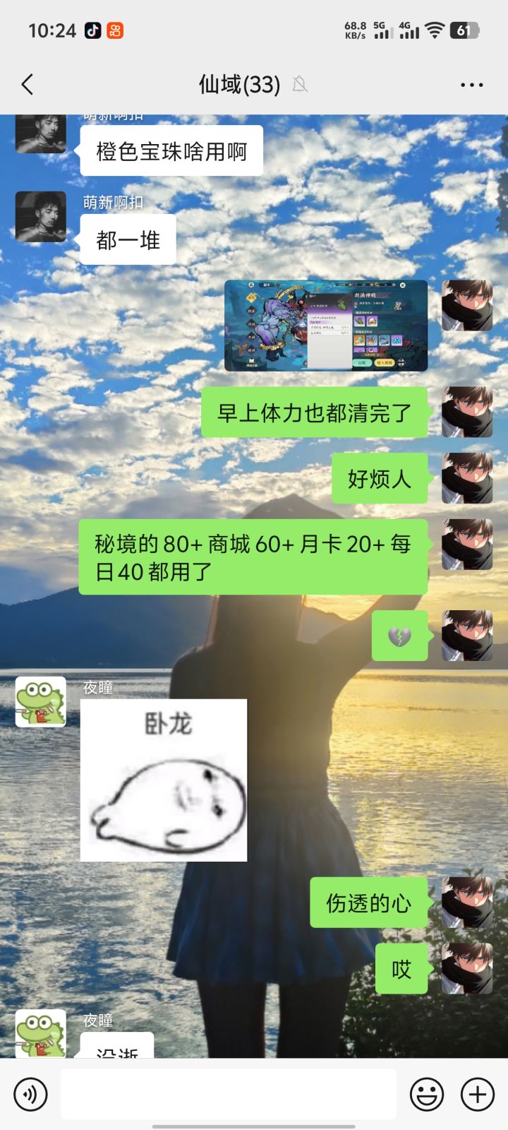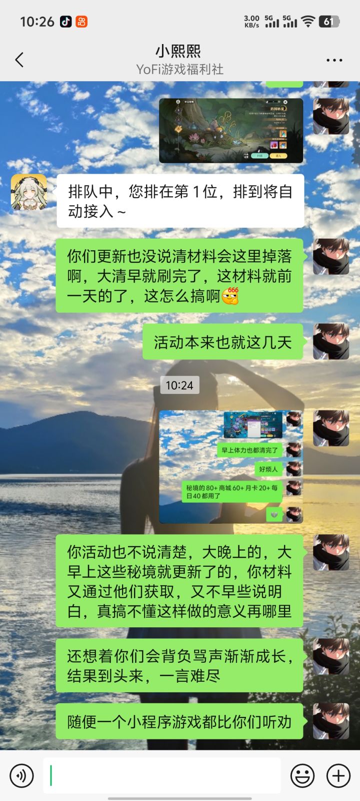 我玩这游戏以来,最开始是真心喜欢这种类型,挺热爱的,但是玩了几天就慢慢出问题了,大家发现这是个半成品游戏,境界才到元婴大圆满,再骂声中,策划过了大半个月才更新化神,结果化神就跟元婴一样无聊,还出各种各样的bug。但是我还是坚信策划会慢慢改进优化,毕竟没有完美的,只要他们听劝就还好,大家也都挺欢这款游戏的。结果内心被策划一遍遍伤害,好多玩家流失,哎~