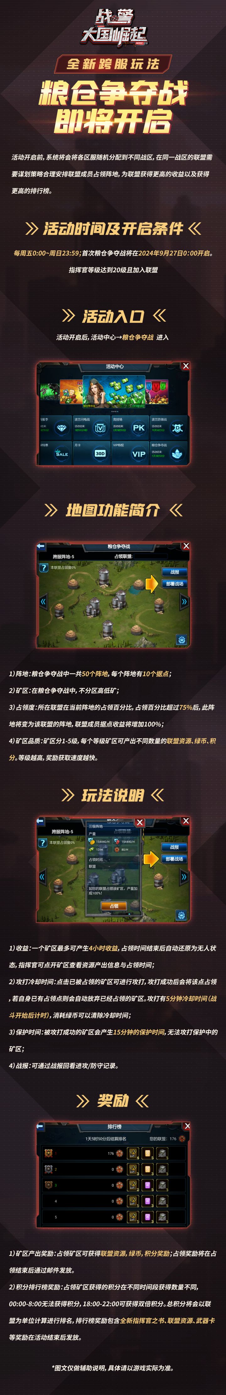 2.0版本爆料|全新跨服玩法粮仓争夺战即将开启指挥官们好!《战警:大国崛起》引擎升级,2.0版本即将上线!关于新版本的内容接下来的几天里,我们将逐步为大家揭秘!本次为大家带来全新跨服玩法「粮仓争夺战」的介绍,详情请参照下方大图。注*1.多位指挥官同时攻打一个阵地时,阵地由先胜利的指挥官占领,其余指挥官攻打无法占领但不损失兵力。2.联盟积分与其他奖励不同,占领结束后直接发放到所属联盟无需手