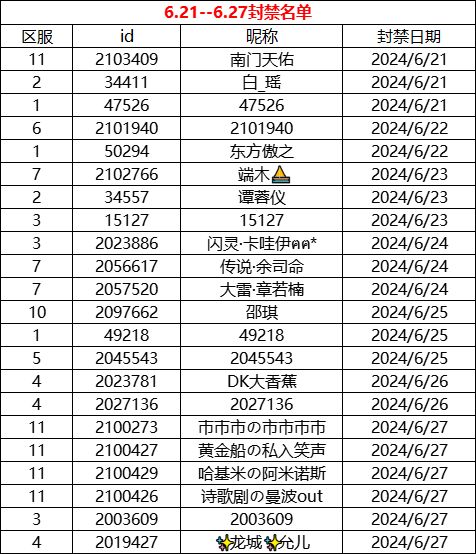 《战警:大国崛起》2024年6.28--7.4日封禁名单