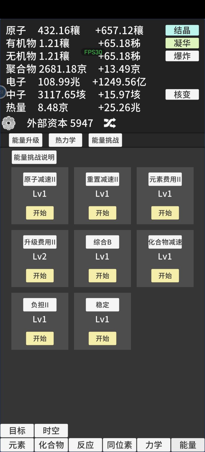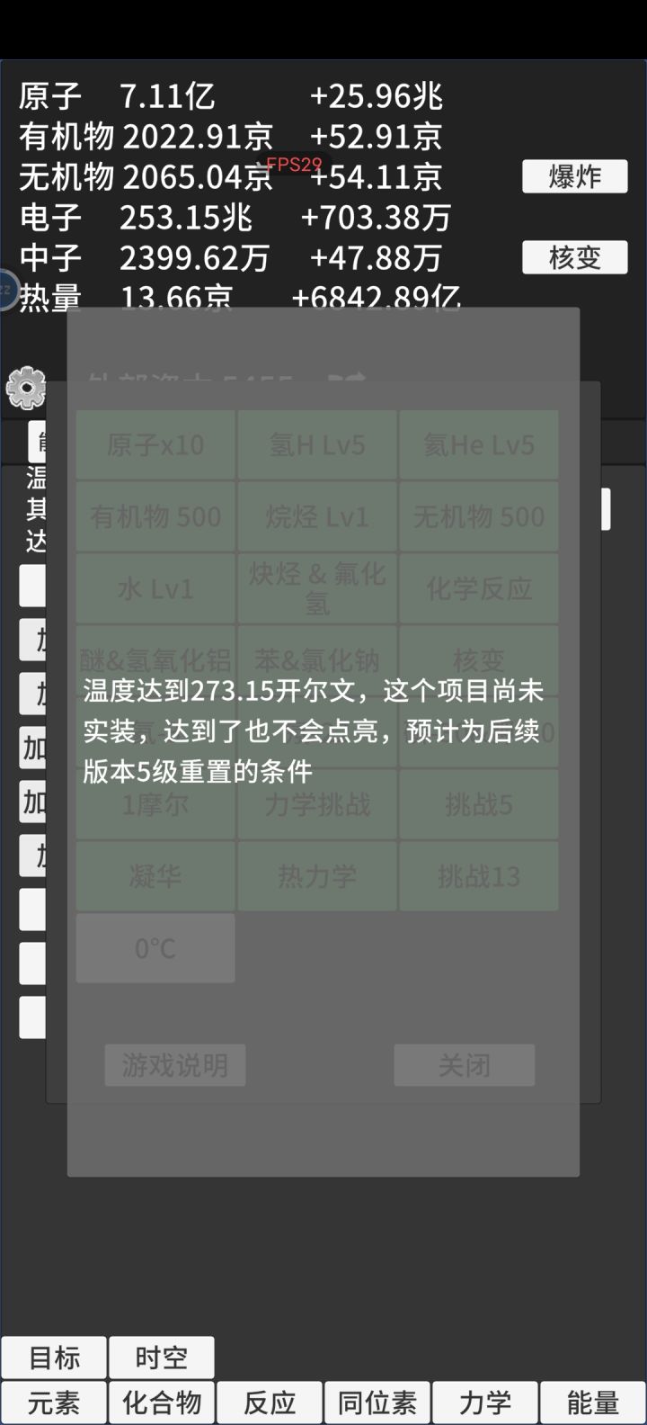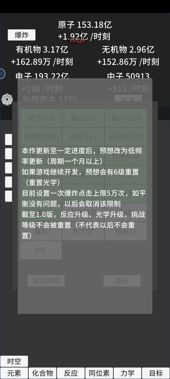 1.化合反应的自动升级没有触发过应该是bug2.氘的化合物倍率没有被苯和氯化钠触发,是自动生产不提升吗3.氟化氢和炔烃的生产加值描述的很迷惑,不清楚到底是怎么加的玩着玩着原子数值不会自动增加了,按理说前四个元素的原子产值一直在累计那这个加值也会不断累计才对。目前只玩到放射性还没开氦3,游戏很不错和其他增量有明显差异而且上头,721难道真的是天才?