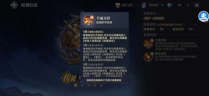 题外话:佛怒唐莲原著中属于范围杀伤最强的暗器之一,能够瞬杀绝顶强者,游戏里佛怒唐莲的技能设计上和原著贴合度还是比较高的。 佛怒唐莲定位【真实伤害】、【能量扣除】,实际该暗器的强度远超这两个定位的总结,下文我会具体分析下之所以“强度超模”的原因。 定位一:【真实伤害】佛怒唐莲的“真实伤害”主要来源于以下两个方面:(1)首先是暗器的出战技能燃动山河,1级即可在首回合造成全体暗器伤害并附加敌方生命