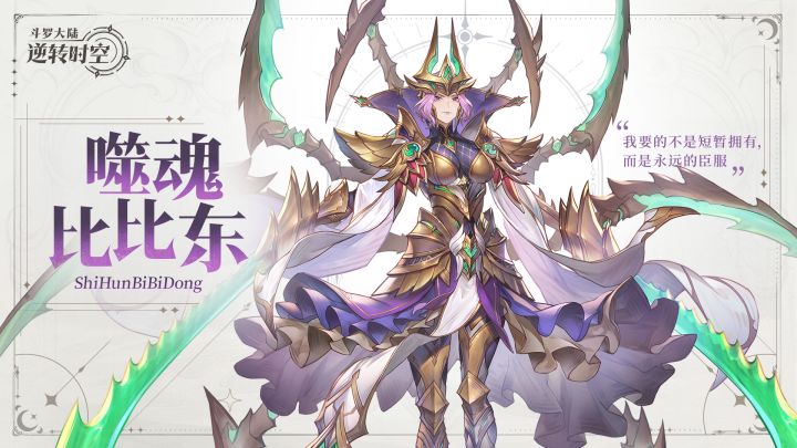 各位传承者们大家好!前段时间,蜘蛛娘收到了一份古老手札,上面写满了奇怪的符号( -'`-)不过凭借本蛛的聪明才智,已经成功破译!原来这本手札是来自武魂殿的一份机密魂师档案!没错,本期情报要介绍的就是「噬魂比比东」! ▌噬魂比比东武魂帝国开国之皇,号令大陆,奴役众生。「这片大地终将臣服于我!」 ▌实机演示在《斗罗大陆:逆转时空》中,噬魂比比东的定位是辅助。武魂真身状态下,每