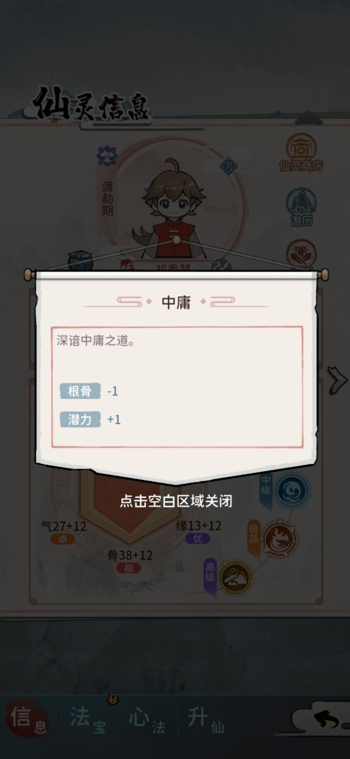 1.氧金这是一个比较核心的方面,决定了发展速度,大致分为三档,0氪林冲狮子头,68免广告党,氪佬。氪金最主要的作用,是加快游戏进度,慢慢还是能玩的。2.天赋加点潜力>机缘>悟性>魅力>其他(其他的大致差不多)记住前中期最重要的就是潜力!潜力!潜力!一个大境界的提升是很大的,潜力不够是无法到达下一层的。3.刷开局(不推荐)要刷只刷潜力!潜力!潜力!重点就三只,陈平安,林渡,叶凡。4.游历选项推
