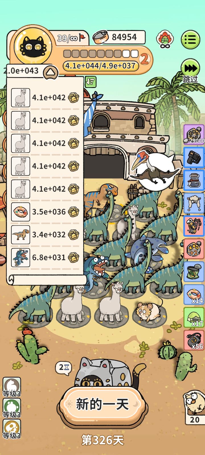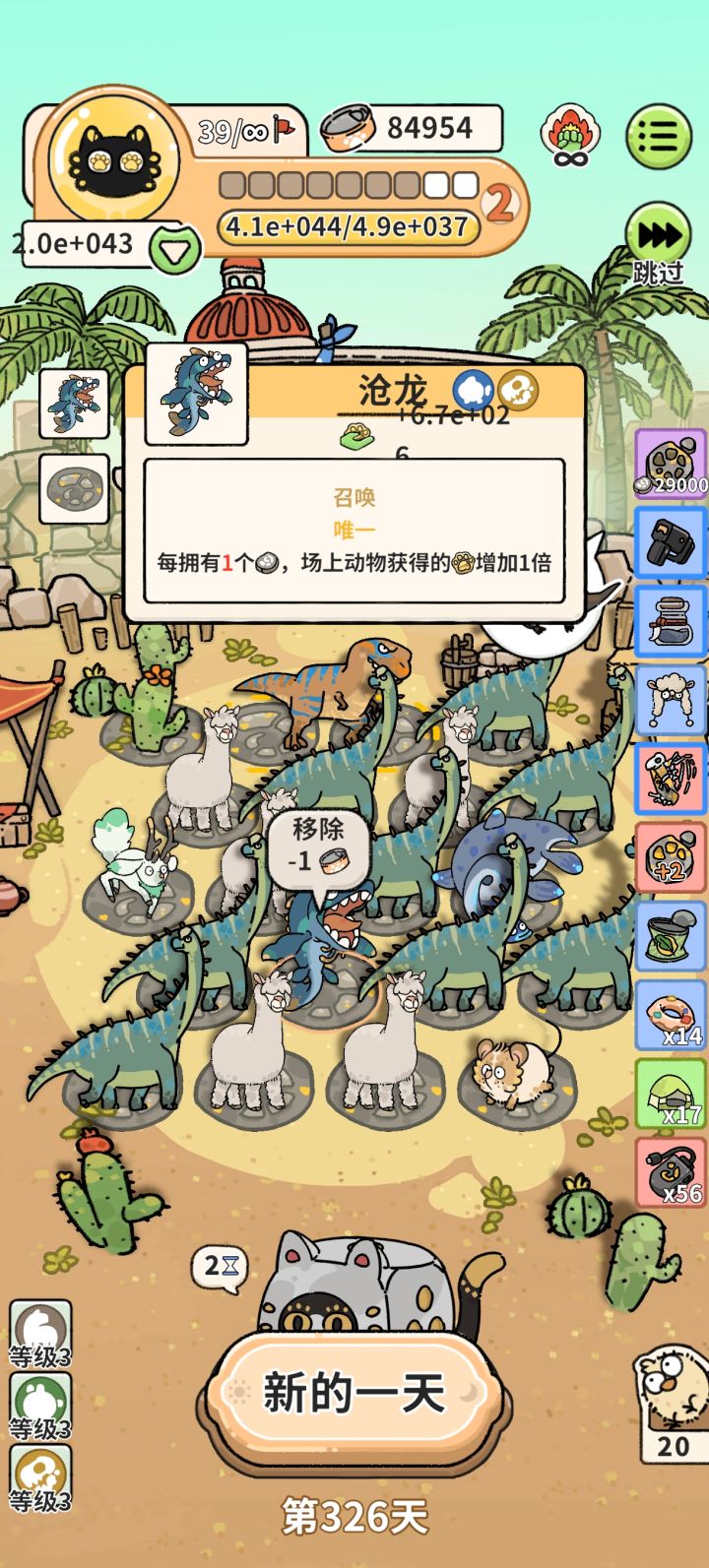 开局道具携带:大饭盆。纸箱子。猫神带猫老大。 开局刷小盗龙,在第一阶段第四天前最少有3只在,纸箱子给的蓝色卡选择双脊龙,道具选择化石扫描仪。第一阶段思路就是,让双脊龙吃其他动物,获得化石,然后小盗龙吸收化石,然后移出双倍,三只小盗龙,就能第一阶段化石破千,倒数第二天移除所有小盗龙。然后二三阶段就这样刷,道具召唤到甜甜圈,化石之力,动物刷到蛇颈龙,就能直接左脚踩右脚。后面就不需要小盗龙,