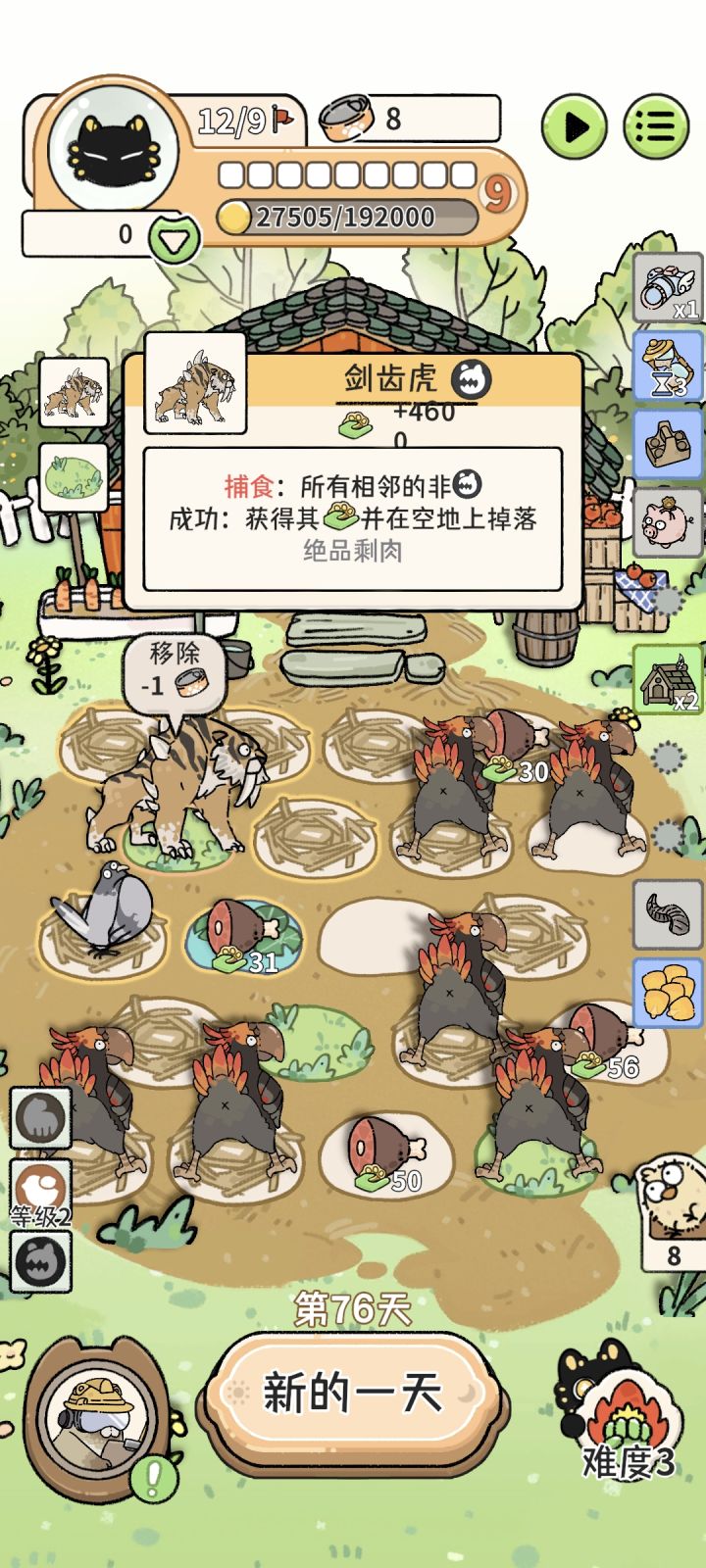 目前玩到第三关,总体体验相当不错,上手快+轻量+随时可玩让它成为了一款不错的休闲游戏,蹲个坑都能来几天,真正的碎片化游戏。一些建议:猫神主动技能的操作没有引导,试了半天才用出来,可以在猫神技能描述的下方加一行字指示一下公鸡母鸡前期收益太抽象。既要挨一块又只有20%的概率,像我这种运气差一点的一个阶段下去可能都没有一个小鸡出发前那个界面中家族是只能携带三个家族去上贡吗?目前只有三