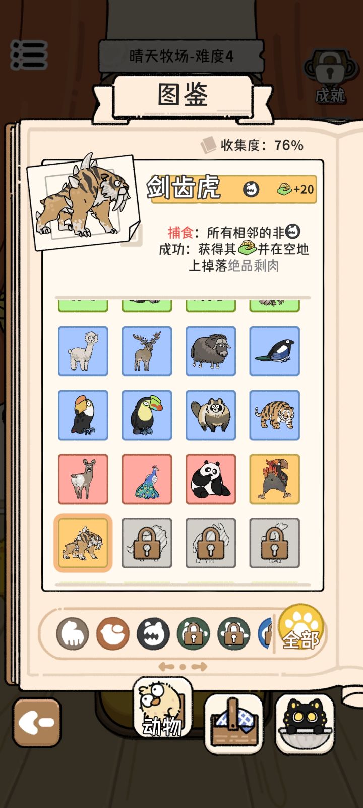 停停停,我说剑齿虎宝子应该是紧张了吧,看到别的动物就应激,不管是不是捕食者张口就吃这个描述里不是只吃非捕食者吗,怎么全给我吃了,一开始吃了只熊猫我还觉得奇怪,结果后面把我剩下的熊猫和老虎也吃了