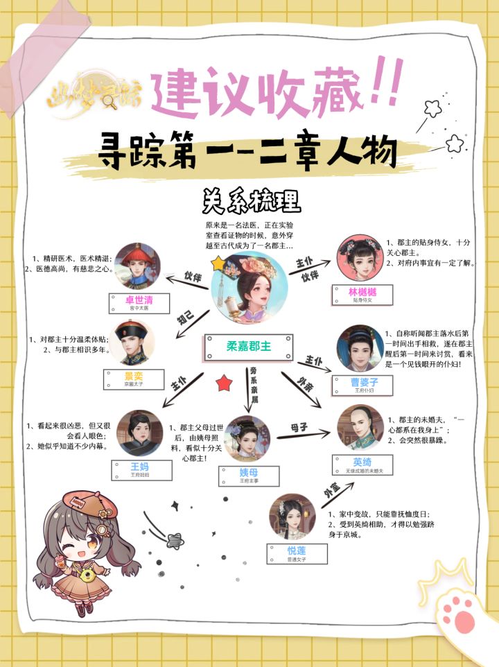 哈喽哇郡主们~寻踪已经开放一段时日,郡主们都玩到第几章了呢?不知道出现的这些人物在郡主心中的初印象有没有发生一些变化呢?来 陪 小 幽 玩 吧❤说说你对截止目前出现的任一角色的初印象与现印象对比~好啦,别忘了正事,以下是小幽为郡主们整理的寻踪第四章人物关系↓↓↓