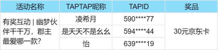 各位郡主好~本条互动已开奖!恭喜以下名单内郡主获奖,请中奖郡主最晚于5月17日 23:59 前凭中奖账号昵称主页截图,前往官方Q群:534561186 联系【幽梦-寻寻】兑奖~逾期将视为放弃奖励哦!未中奖的郡主也别气馁哦,小幽将会在接下来的日子不定期发布更多有趣的有奖互动在论坛内,同时还有一手游戏相关资讯分享,郡主们可持续关注小幽在论坛内的更新哟~~测试结束一段时日啦,但不代表我们和郡主之间