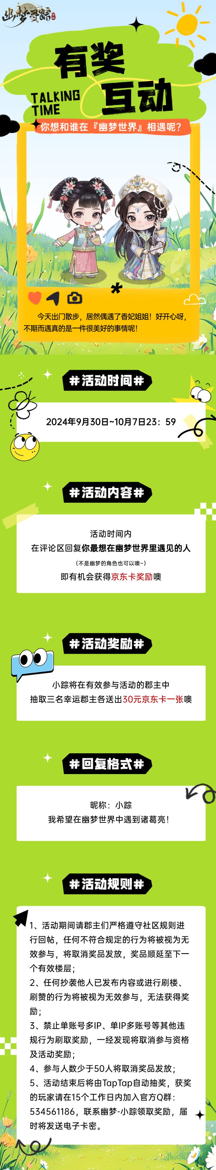 各位郡主们好呀~本次活动已开奖(先跟郡主们道个歉,由于本次活动存在一些争议回复,故开奖时间晚了一些,还请谅解)恭喜以下名单内郡主获奖,请中奖郡主最晚于9月1日 23:59 前凭中奖账号昵称主页截图,前往官方Q群:534561186 联系【幽梦-寻寻】兑奖~逾期将视为放弃奖励哦!(ps:经核实,本次互动前三名均为同一名用户,存在刷赞行为,故取消参赛资格,奖励顺延)千呼万唤始出来~咱们幽梦的二测