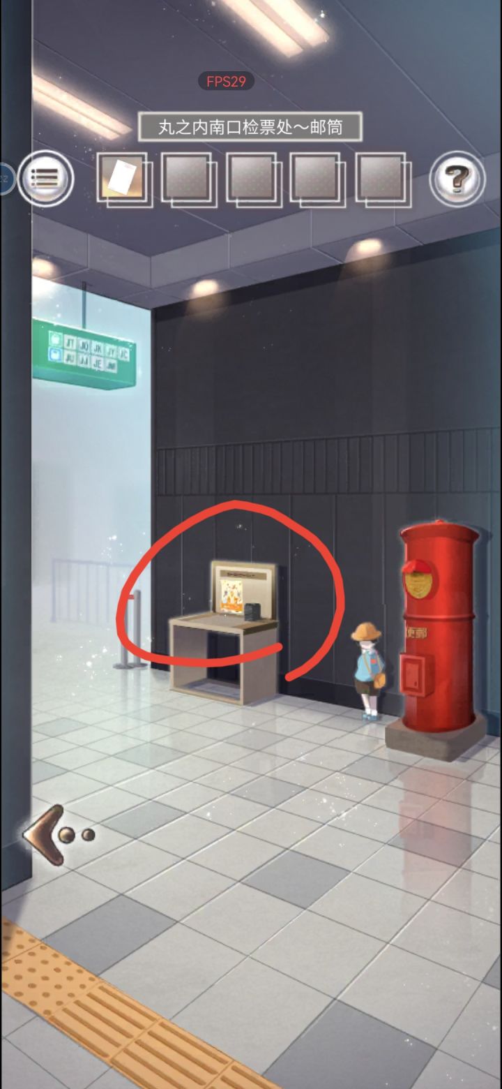|(章节九-章节十三)章节九1.(礼品店)点击地上的白色箱子,获得【开洞的金属牌】2.(丸之内北口检票口)点击售票口,获得【纸巾】3.点击贴在柱子上的海报,使用【开洞的金属牌】,获得线索(TIME)4.(储物柜)点击药店,在柜台获得【净甲液】5.(礼品店)把【净甲液】倒到【纸巾】上,获得【蘸满净甲液的纸巾】6.点击旁边的门上的密码锁,用【蘸满净甲液的纸巾】清除上面的粘着剂7.根据