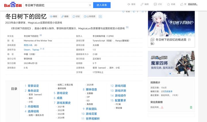 【注意:如果你对如何解锁结局等游戏内容有疑问,可以查阅本游戏的百科词条!】 注意事项:如最后一图所示,把页面拉到最底部,通过内链可以快速跳转到游戏的各个关联页面 词条包含内容: ①游戏发展历史 ②游戏主要剧情 ③游戏解锁各结局方式 ④游戏OST信息 ⑤游戏开发团队信息 ⑥游戏本身和制作人的花絮 ⑦对游戏世界观的一定解释 ⑧续作信息 ⑨游戏问题 ⑩游戏鉴赏家对本游戏评价 ⑪