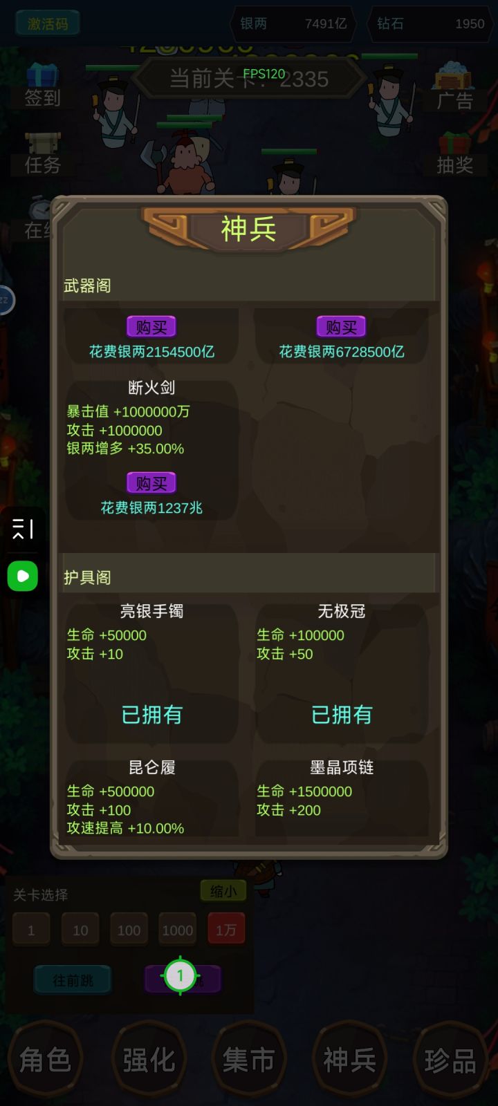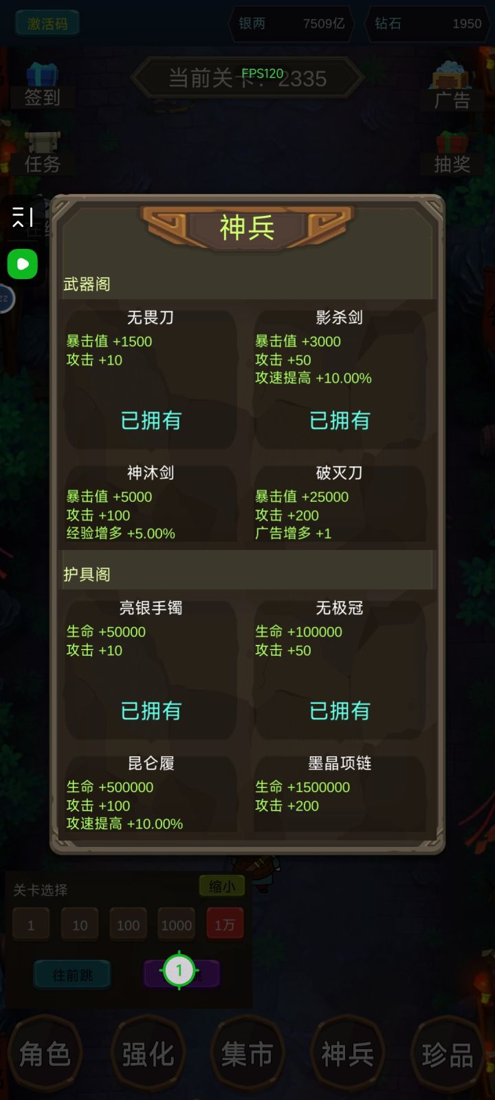 玩了1个小时,提几个建议和问题一,暴击值这属性是啥意思二,金币数字到了4位数以上,能不能转换一下单位,1111111万,能不能显示成111亿,1111111亿显示成111万亿三,这个神兵得肝到啥时候,一把才多少钱四,神兵里广告增多这个属性是在开玩笑吗,嫌广告不够看是吧,搞成看一免二或者广告收益增多也行啊五,珍品能不能搞个一键升级,一个个找得半天六,珍品属性可以就挂在珍品上,不用一个个点