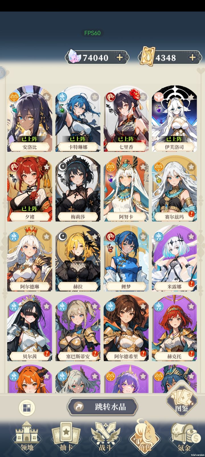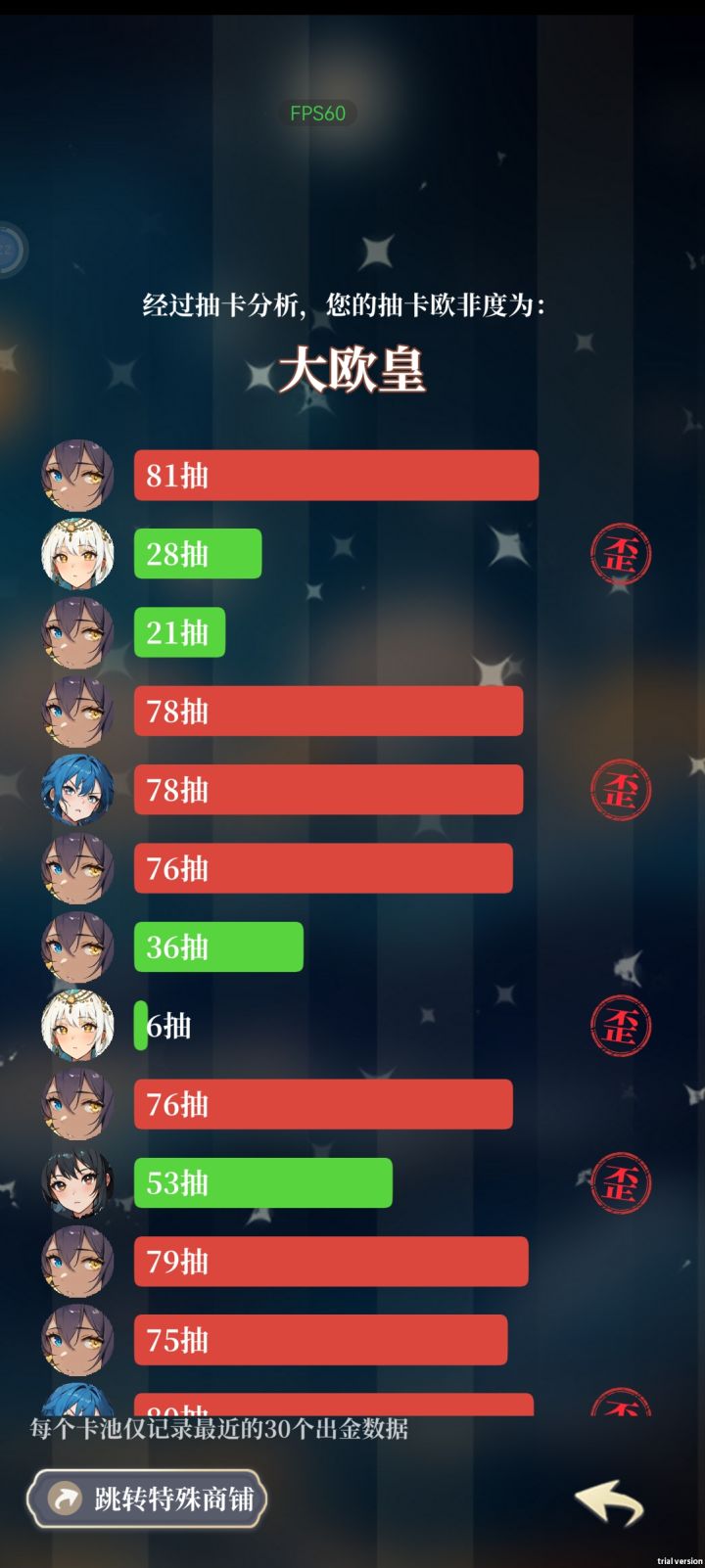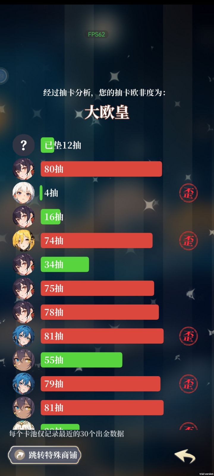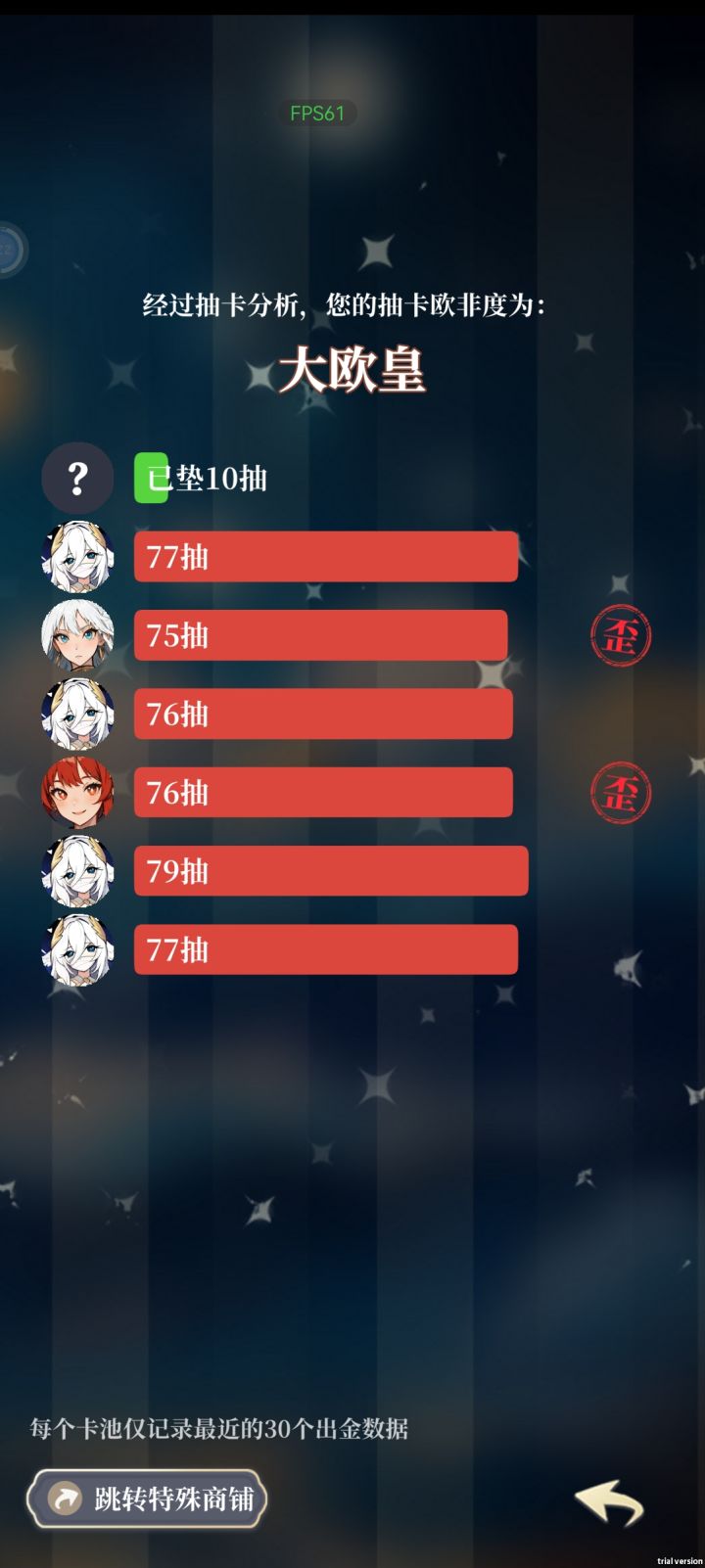 打了一天,首先说这个游戏可玩性不算太高,玩法很单一,但是尚在他有一个一键跳过这个挺人性化的,再说抽卡机制,非酋就是非酋,不要妄想在这儿呢咸鱼翻身,但是有一点,对于我这种微氪甚至可以说是零氪的玩家来说,这种免费超级氪金游戏挺有意思的让我感觉非常的爽,像以前对于我来说需要攒好久才能攒出10抽20抽的游戏来说,这个游戏真的让我非常的满足,看两个广告随随便便就能整出个三四百抽四五百抽,能让我一次性抽个爽,