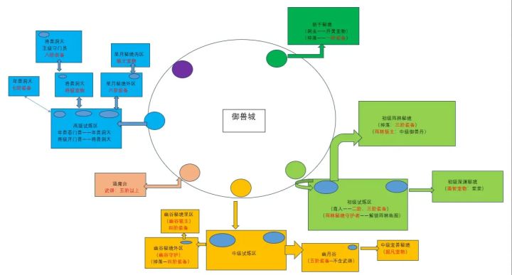 小白攻略,养老咸鱼玩家的发烧友。这游戏强调两个核心,运气和金币——宠物和装备掉落看脸,宠物和装备强化看脸,这个节奏从头贯穿到尾。一、地图篇有了地图不迷路,重新画了个递进图,蓝色椭圆是传送阵,颜色把地图区域分开了。1.御兽城——白色区域——新手村,10级以前混迹的地方,一直刷蜜蜂,攒钱攒任务物品,凑够一套一阶装备,还有越多越好的中级经验丹。2.新手秘境——深绿区域——刷初级宠物,九尾狐,松