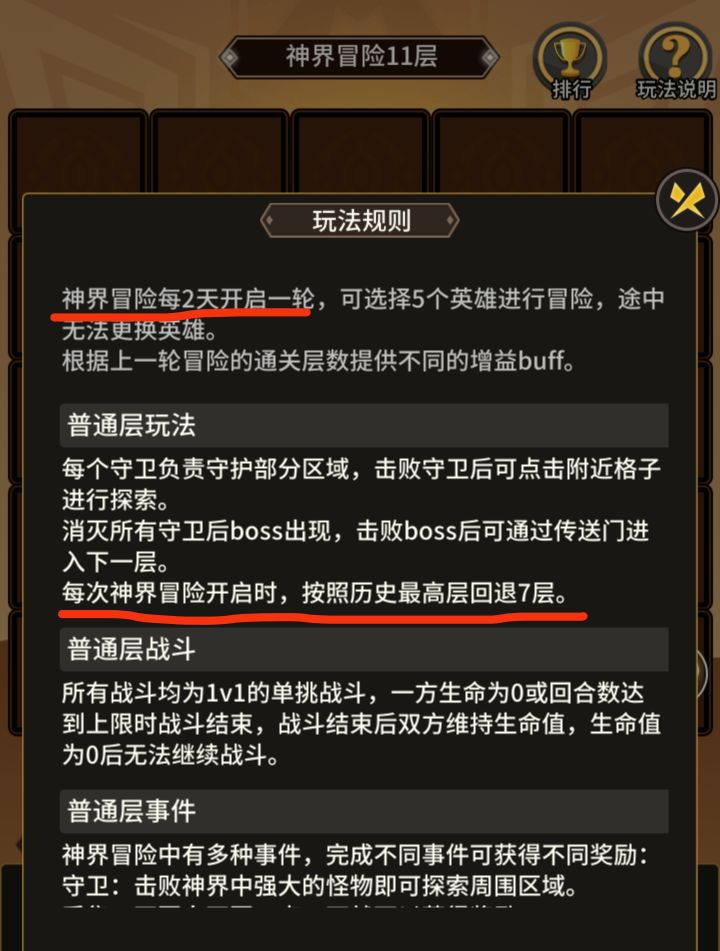 神界冒险50级开启。两天一轮。尽量倒计时最后一天再去打。因为有些日常活动任务需要打这个。层数越打越高,只回退七层。没必要往上面打,打个7层就好,拿一下奖励。商城主要购买先知水晶。打过的怪有商城就要点一下!!!商城只会出现!两次!先知先知。每次都有一个先知,有概率另一次出三个。两次水晶出了,就没必要往上刷了。金币可以购买一些竞技场次数和经验。钻石看条件,可以购买一些高级抽,留着