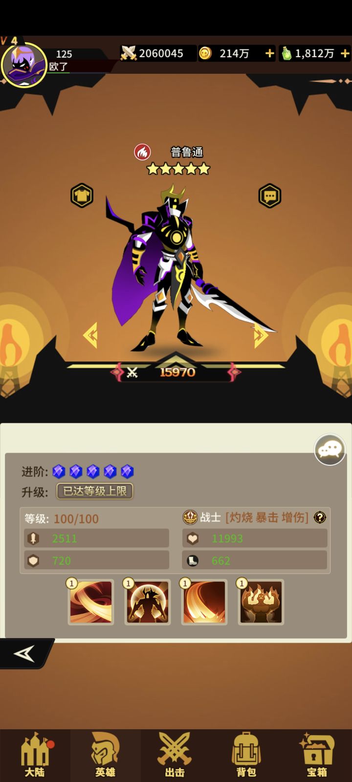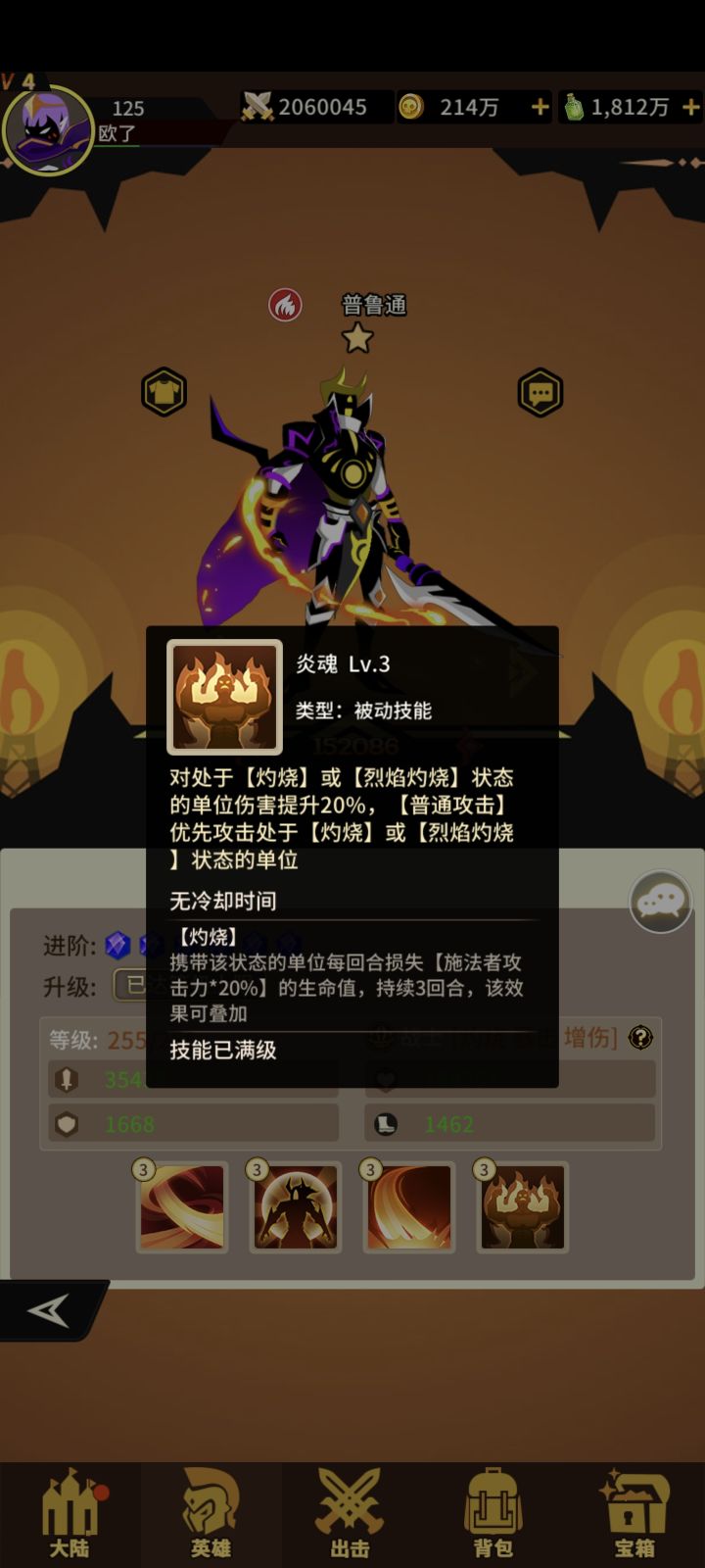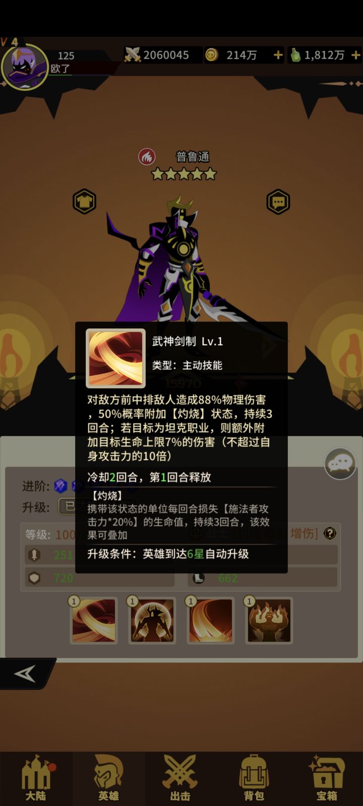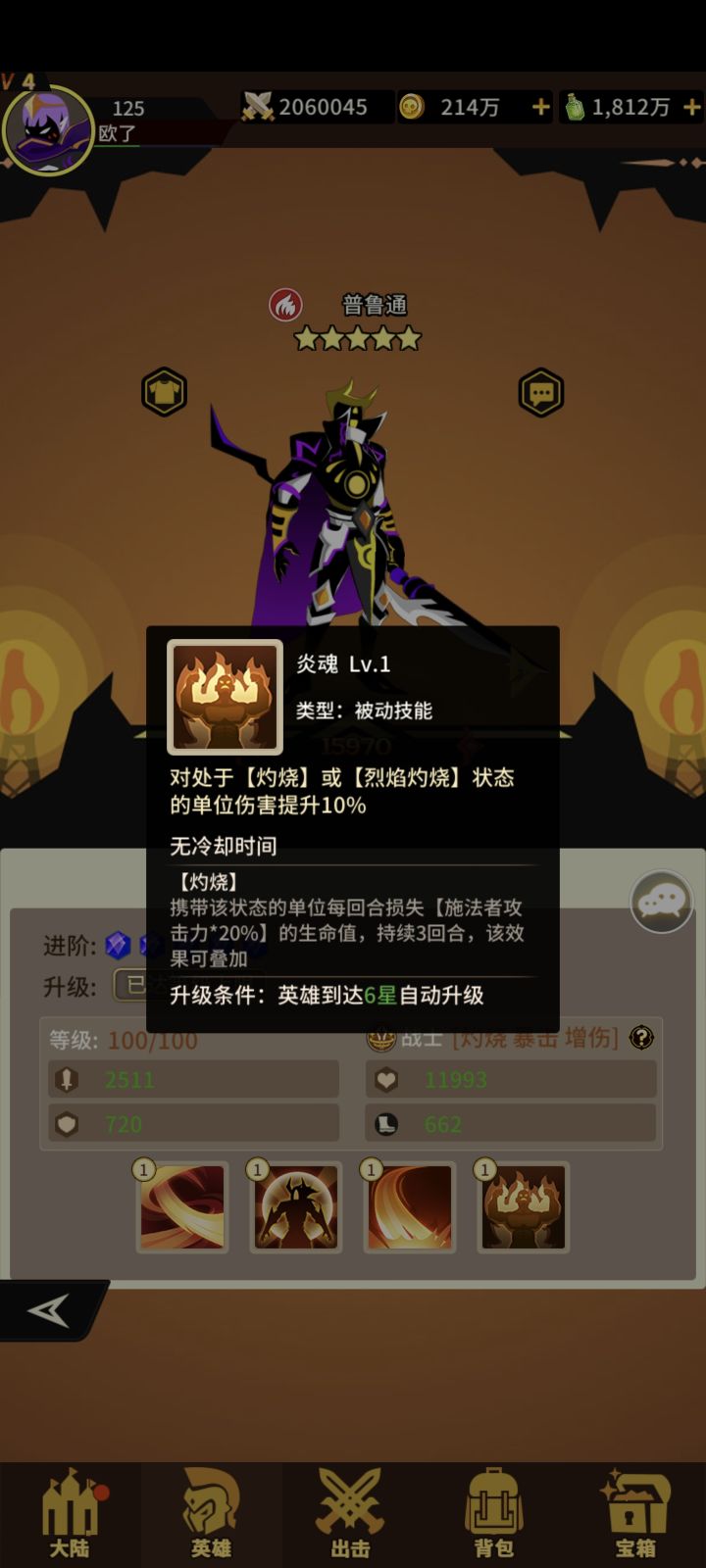 火系战士普路通四技能!获取难度难!抽卡+积分兑换+宝箱!一技能打前中排概率+灼烧如果打的是坦克增加伤害!二技能+生命+攻击+速度满级自身收到攻击概率给施法者+灼烧 三技能打生命最低的敌人单体攻击目标带灼烧或烈焰灼烧必定暴击!四技能对处于灼烧或烈焰灼烧的敌人+伤害!满级优先打带火焰状态的敌人!优秀的战士!#浅评一下