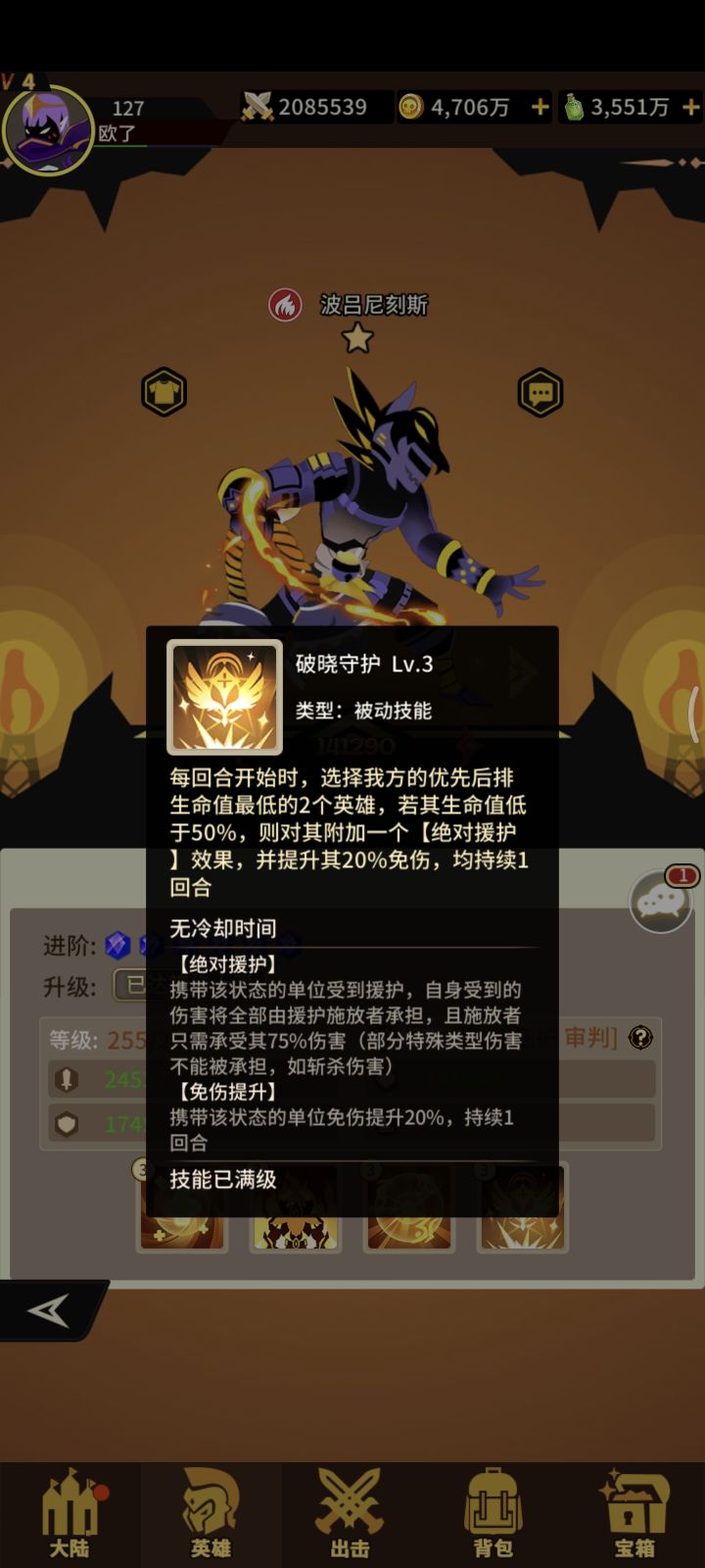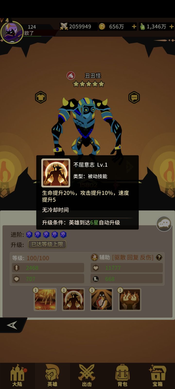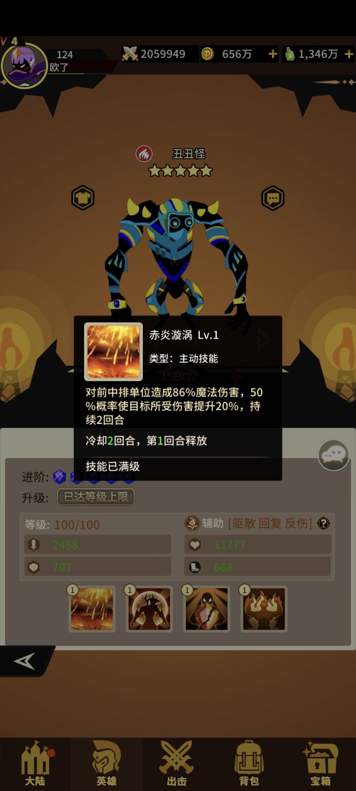 火系辅助丑丑怪四技能!获取难度难!抽卡+宝箱+兑换!两个🈷一个没抽到好英雄概率都低!一技能打前中排概率+受伤害提升!满级概率+驱散目标一个增益状态!二技能+生命+攻击+速度 三技能给三个队友+护盾(攻击者受到百分比伤害!类似于反弹盾)四技能队伍暴击就恢复全体百分比血量!这个技能牛逼!抽到就养起来吧#浅评一下