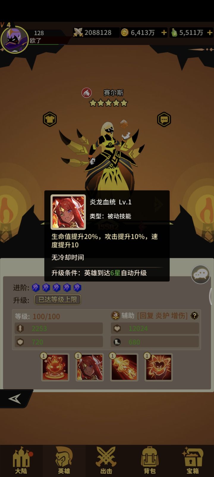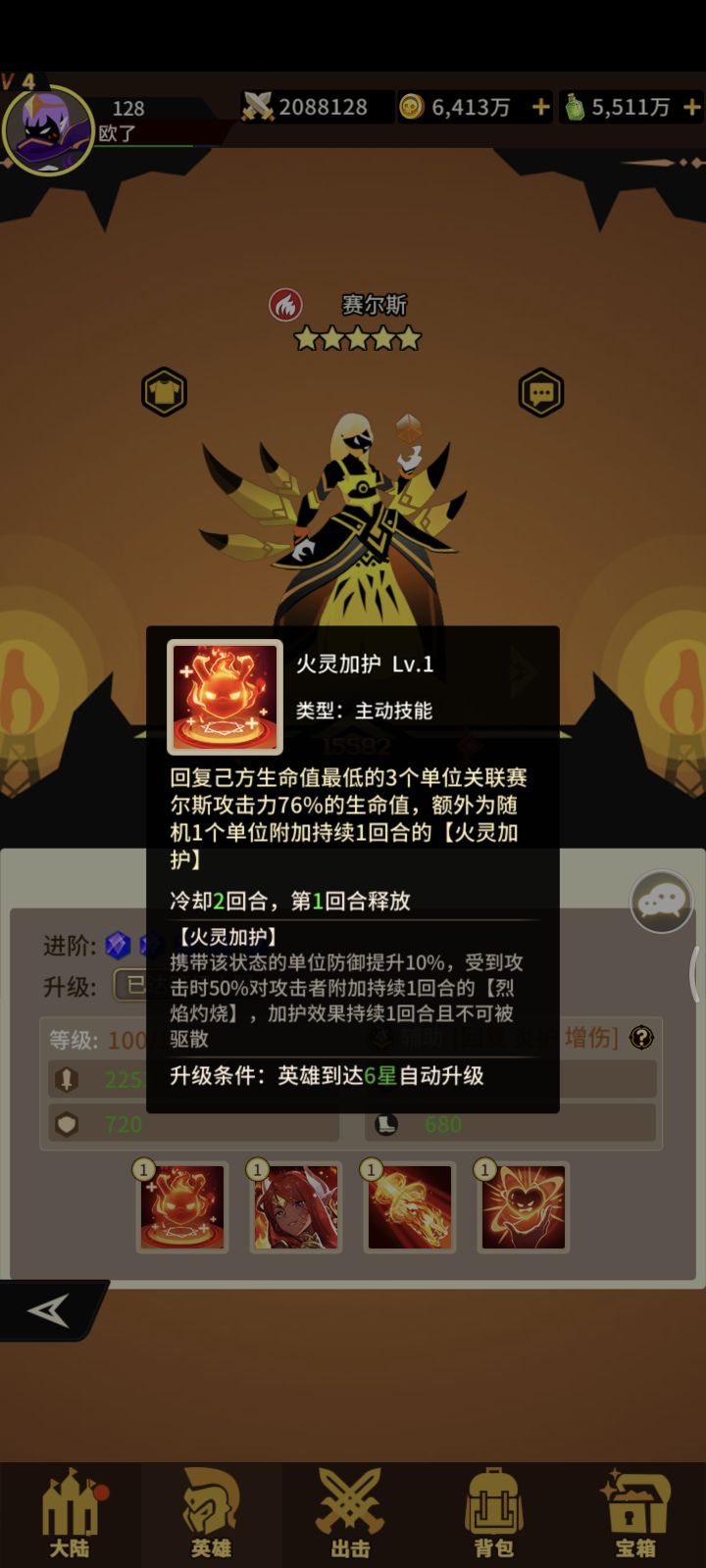 火系辅助赛尔斯四技能!获取难度难!抽卡+宝箱+兑换!一技能给三个队友+生命随机给队友+援护(+防御概率给敌人+烈焰灼烧)满级给两个队友+援护!二技能+生命+攻击+速度!!三技能打四个随机给两个敌人+灼烧 四技能收到持续技能伤害转换部分伤害为生命平摊给存活英雄!治疗量不超过攻击两倍挺🐂的辅助!抽不到!