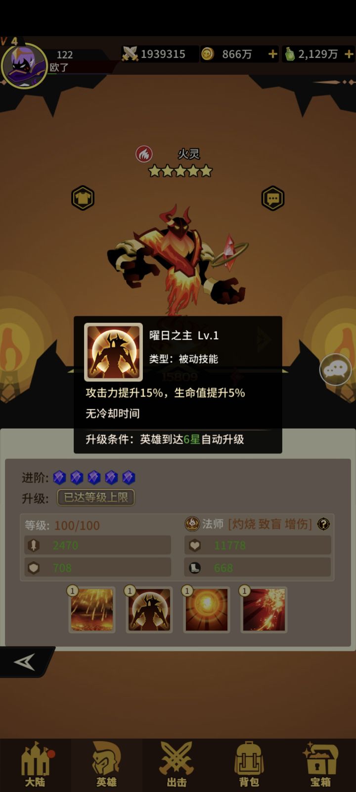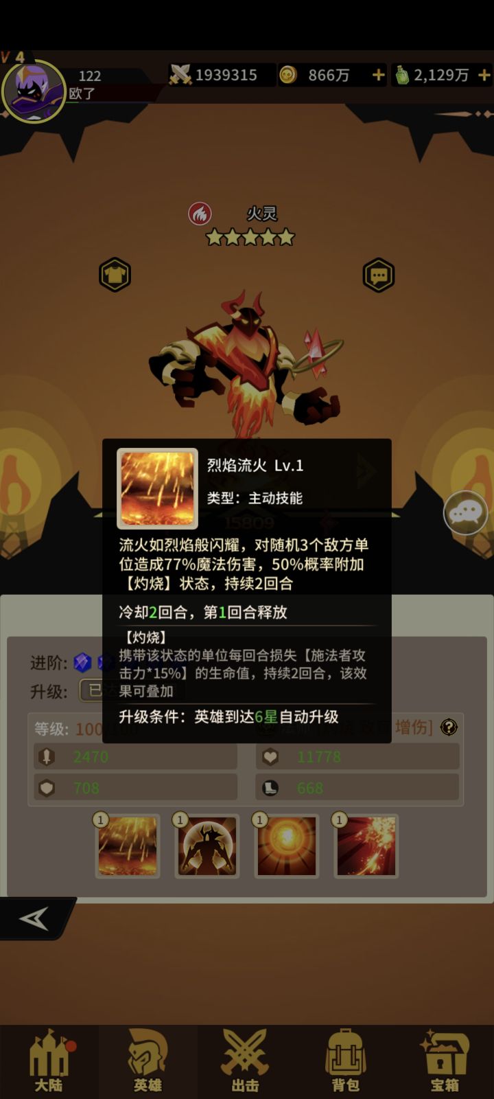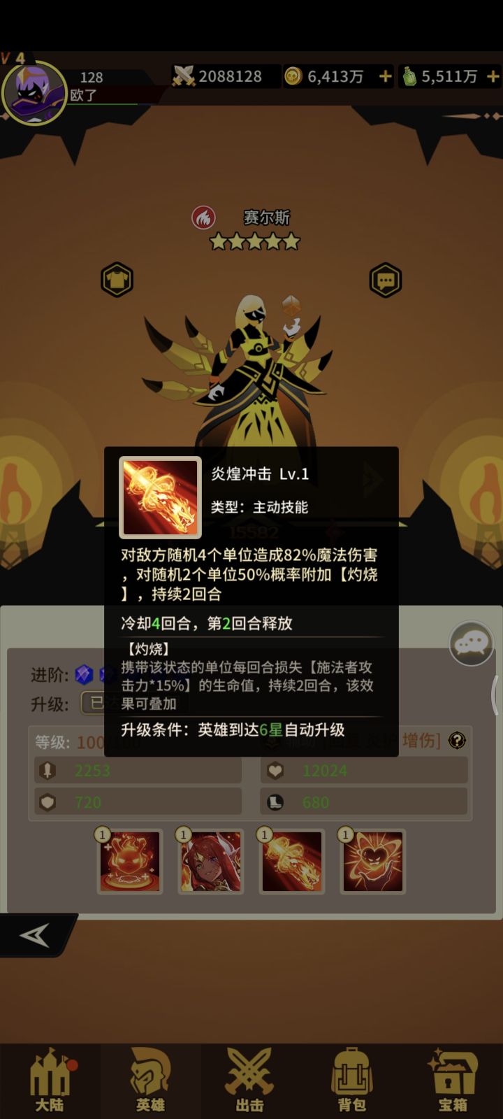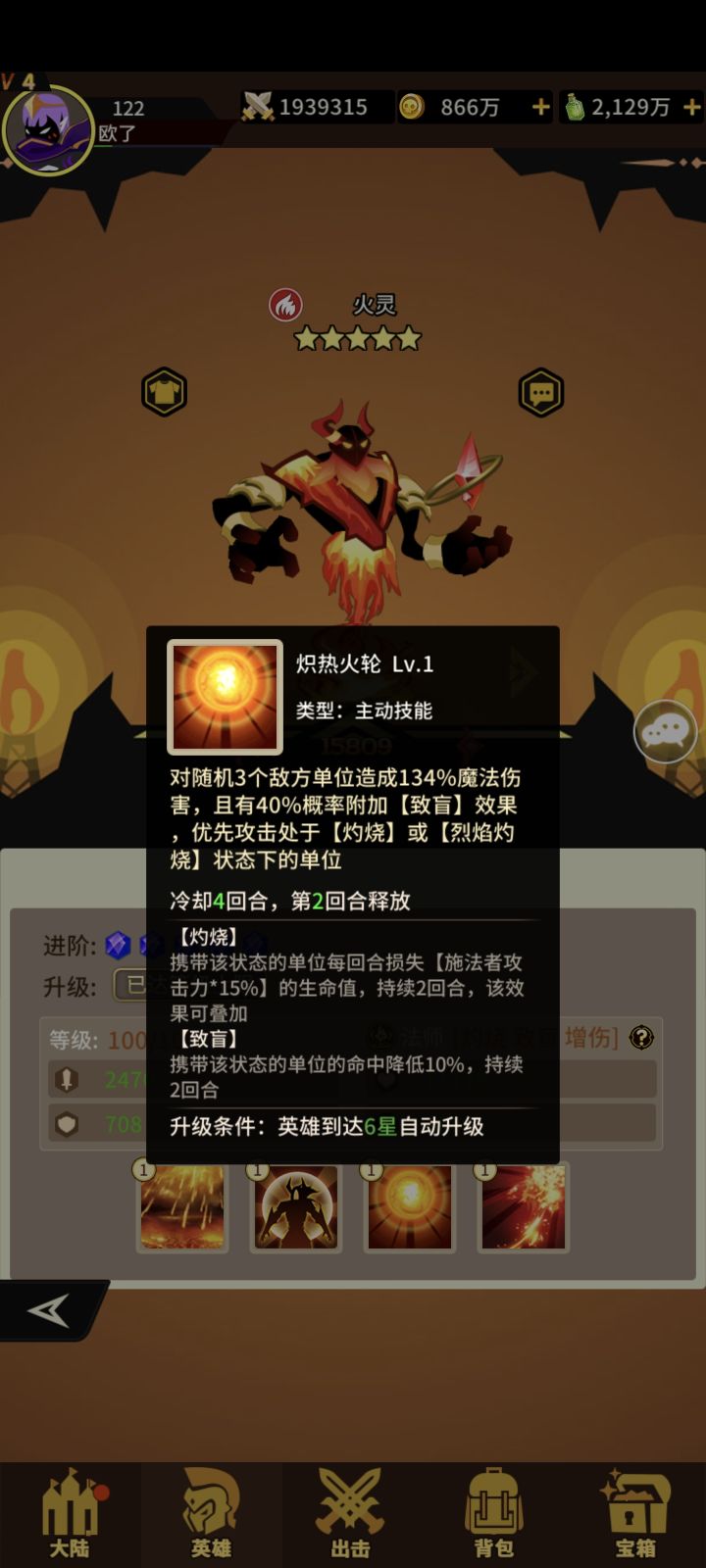 火系四技能法师!获取难度一般!抽卡+宝箱+兑换!一技能打三个概率+灼烧(每回合损失生命)二技能+攻击+生命 三技能打三个敌人概率+致盲(携带该印记命中降低)优先打带灼烧或烈焰灼烧状态敌人! 四技能 对灼烧烈焰灼烧的敌人增加伤害且伤害时增加暴击!普攻也是优先打灼烧和烈焰灼烧的敌人!一般没亮点!我拿它坐狗粮!#浅评一下