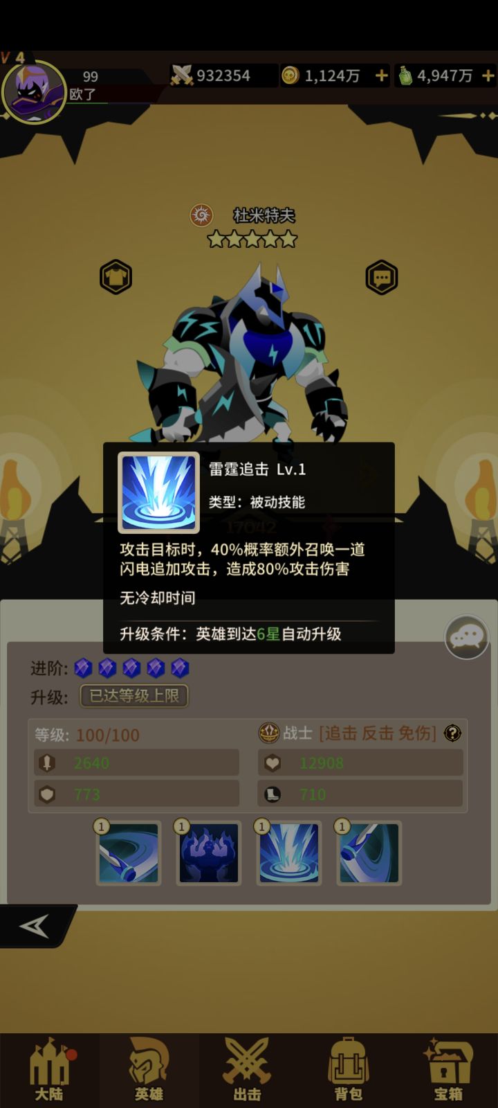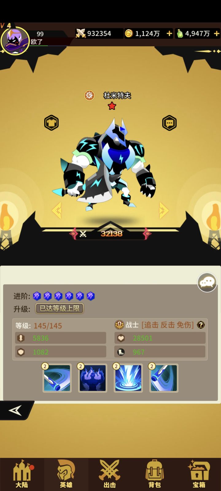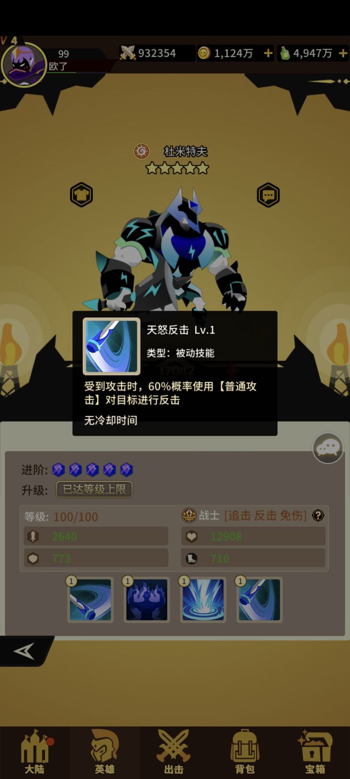 光系战士杜米特夫!主反击!获取难度中等!抽卡+积分加宝箱+兑换!一技能打单体无视防御满级伤害恢复百分30血量!二技能+攻击+爆伤满级+暴击受到伤害不超血量百分30!三技能概率闪电追击!四技能受到伤害概率反击!满级百分百反击!光系必练!符文再弄个回血是不是就更牛叉了!#浅评一下