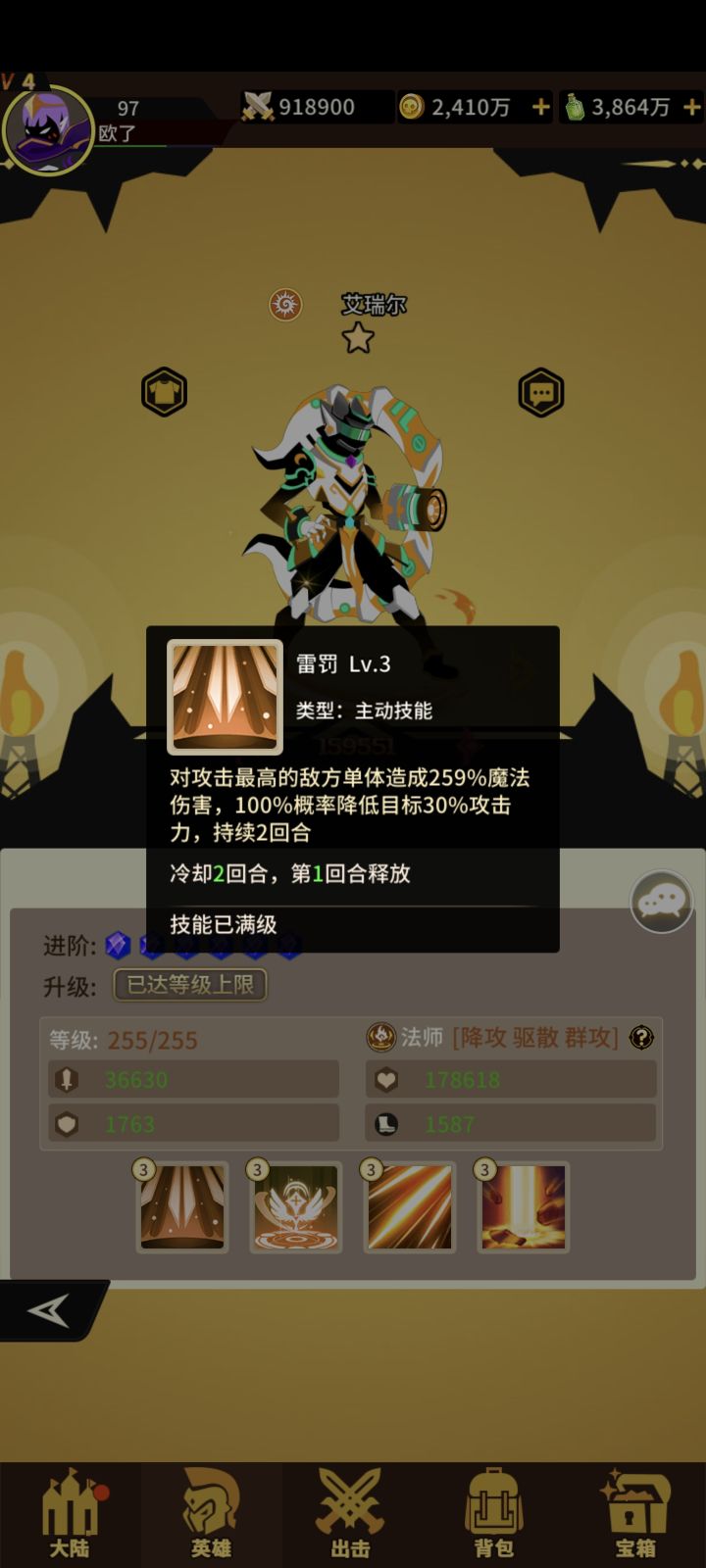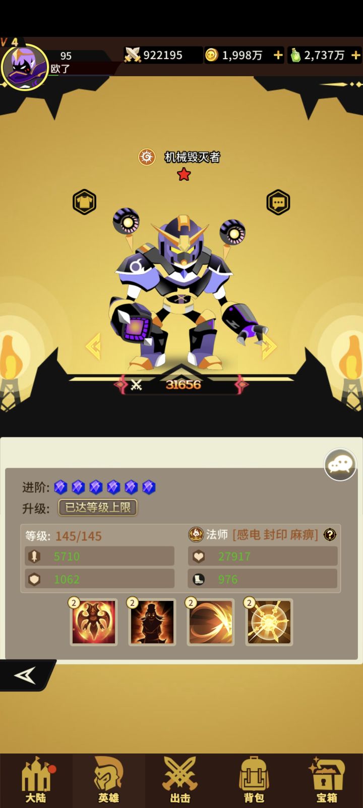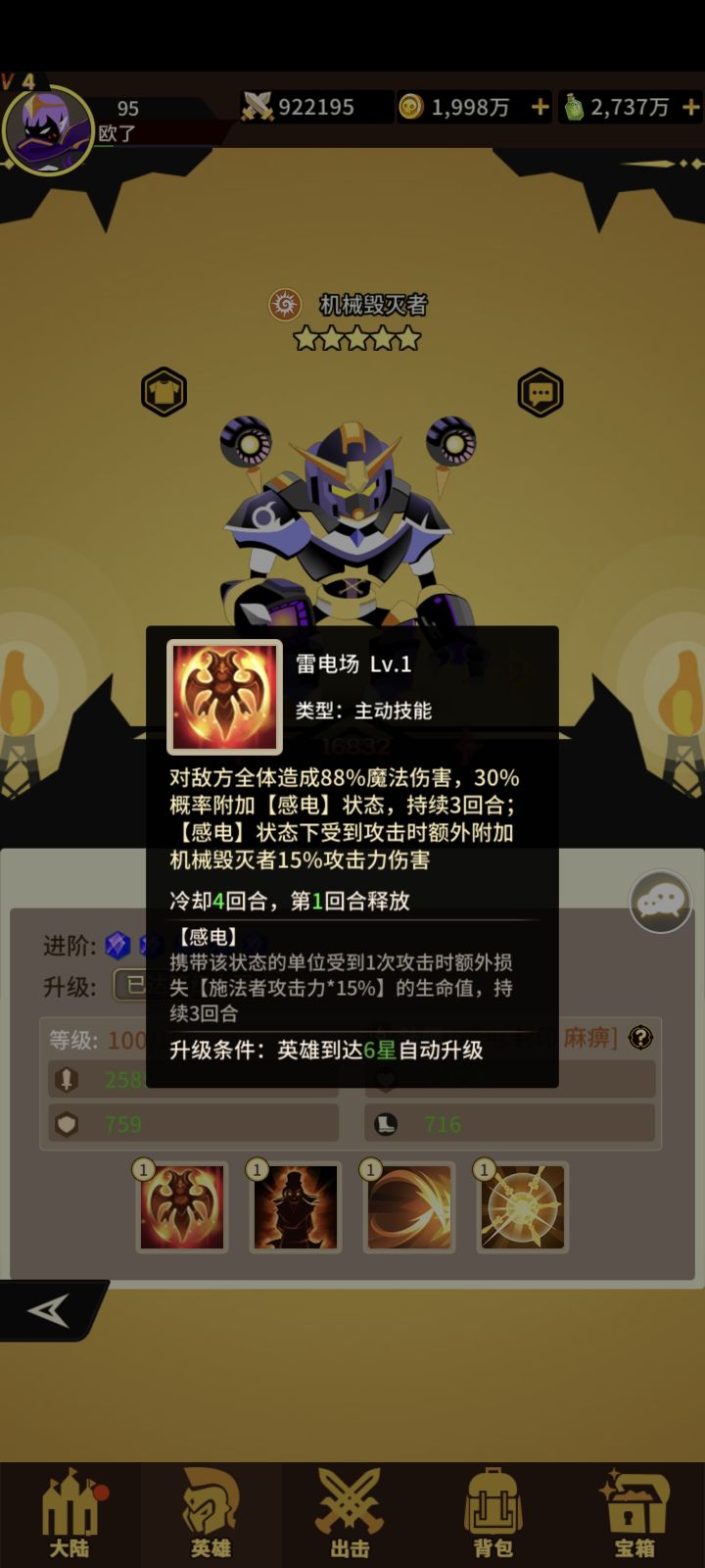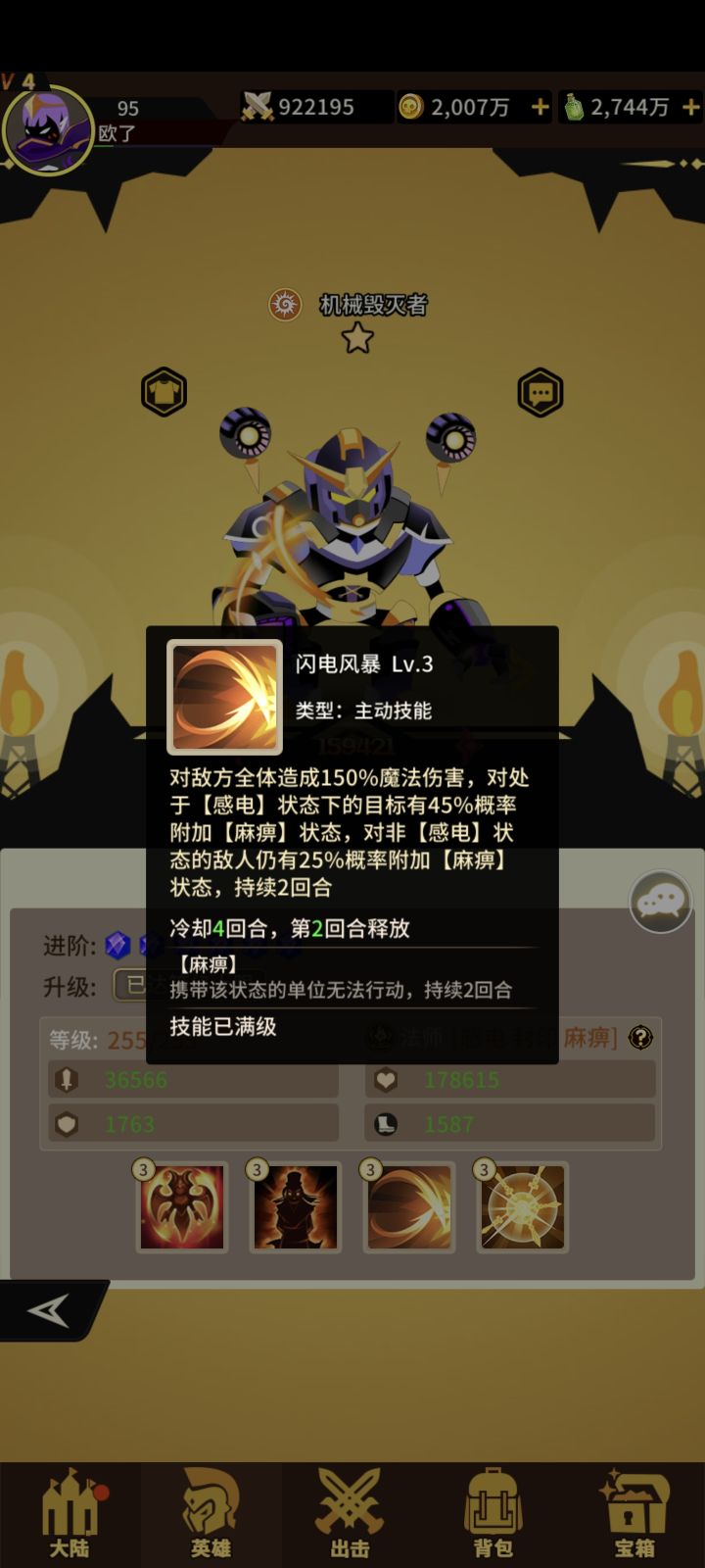 雷电毁灭者光系法师!获取难度一般!抽卡概率获得!积分兑换!宝箱!本人抽这个出了不少感觉挺好出!一技能雷电打全体!概率+感电状态!二技能+攻击+生命+速度!三技能打全体感电状态概率麻痹两回合!满级非感电状态也有几率麻痹两回合!四技能概率让敌人不能暴击!很好用的法师光系必养!推荐#浅评一下