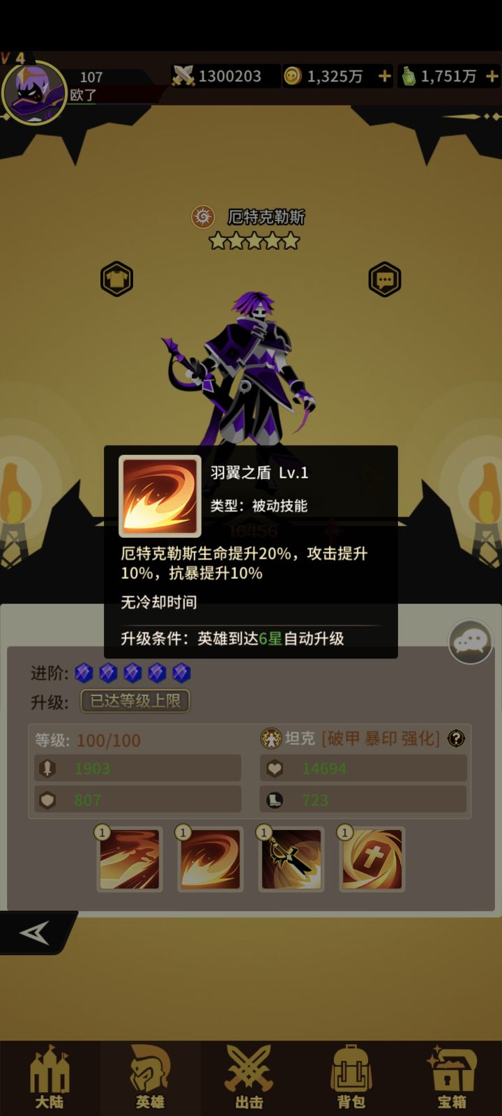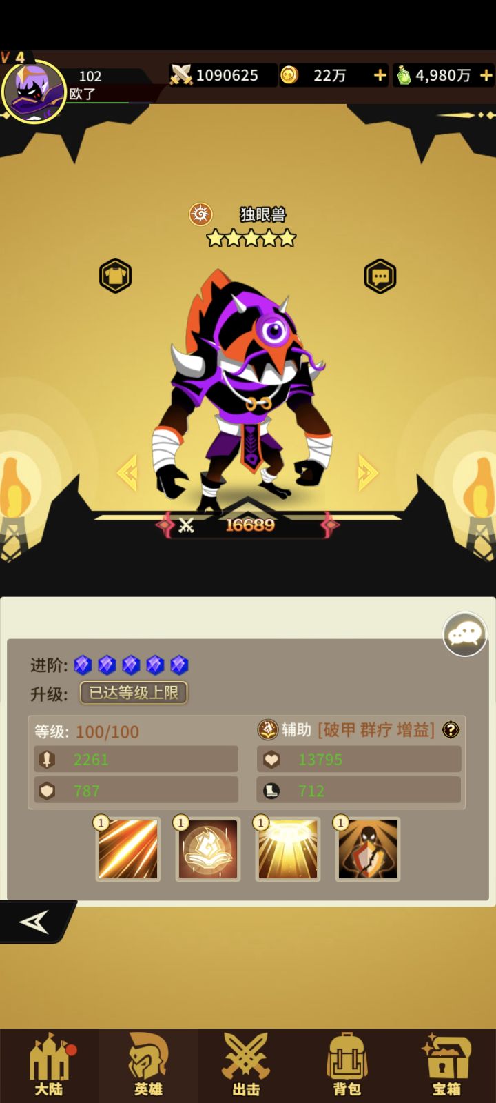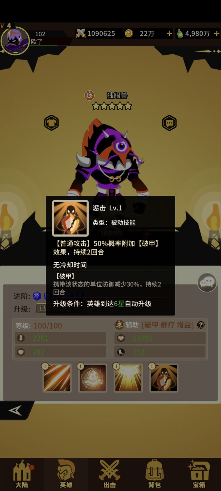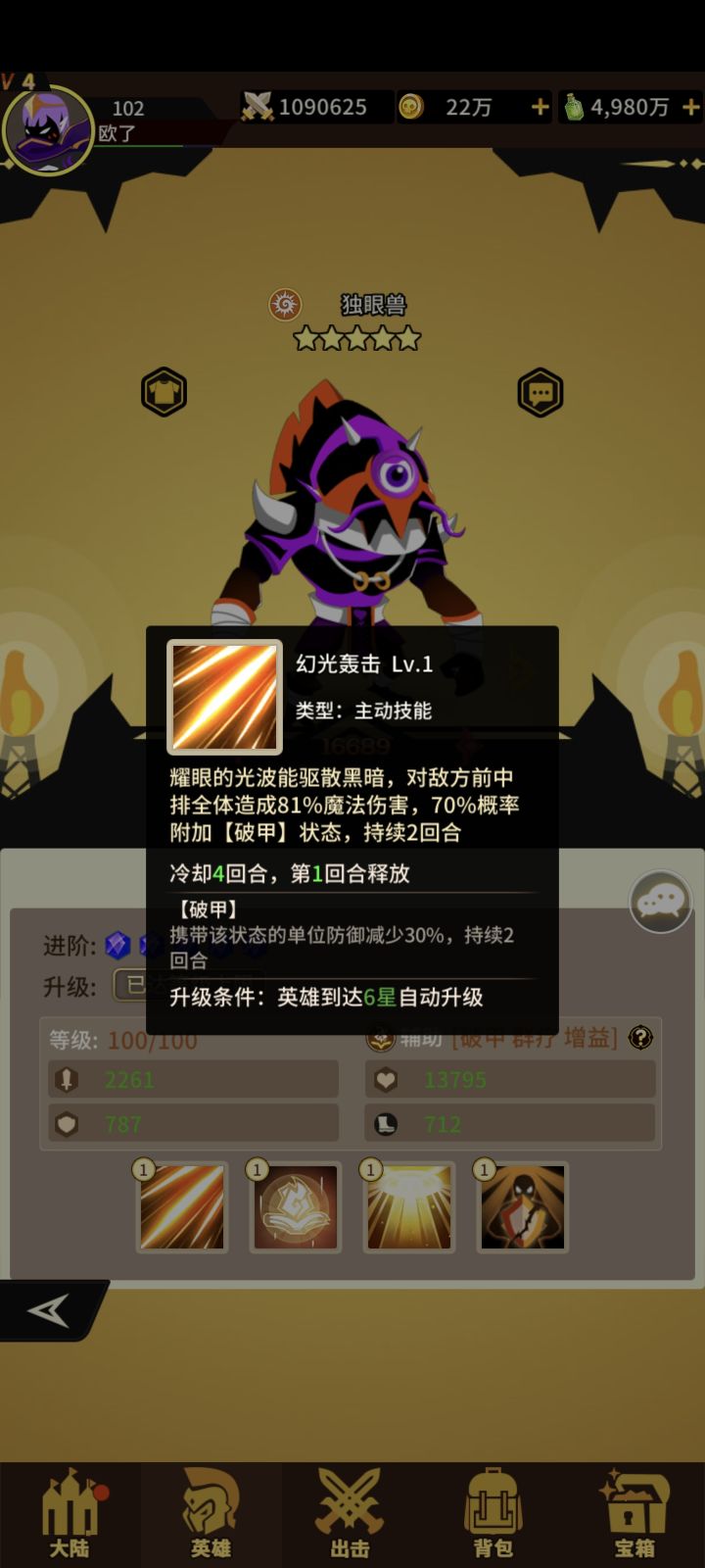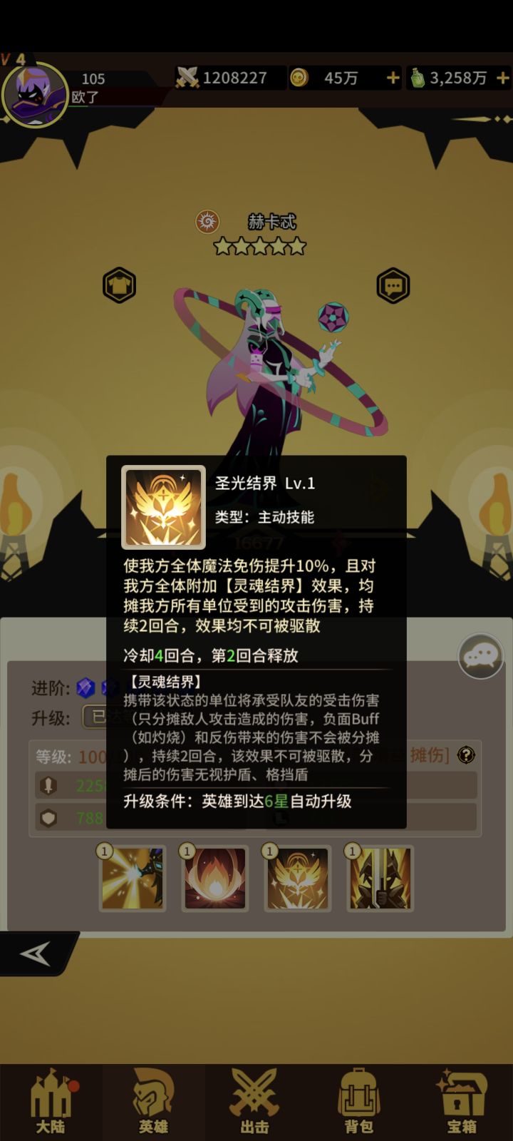 光系坦克!获取难度中等!抽卡+宝箱+兑换!一技能随机打四个概率+破甲!二技能+生命+攻击+抗暴击!三技能受到攻击概率给敌人+神灵爆印(敌人暴击你给敌人伤害)四技能受到伤害概率给敌人+神灵爆印辅助100%+爆印 感觉这个就是为了挨打而生啊!还得被暴击才能🈶伤害!后期敌人暴击高应该还可以!个人不喜欢这样的英雄太局限了!#浅评一下
