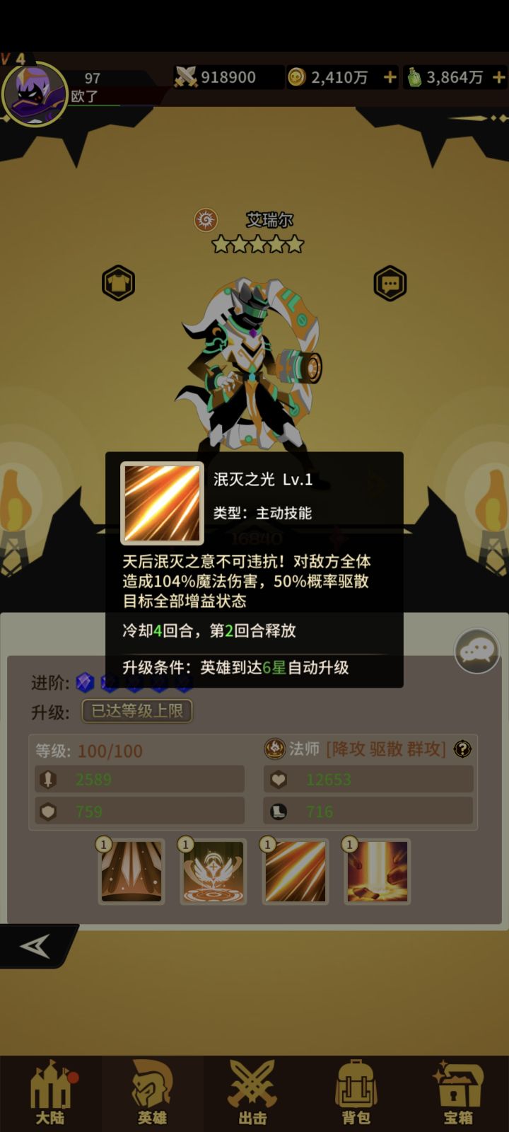 光系辅助法师!获取难度一般!抽卡+积分+宝箱!一技能单体打伤害最高的单位概率降攻击力!升满级百分百降攻击!二技能+攻击+生命!三技能打全体驱散增益状态!这个挺实用!四技能强化一技能!外带再打一个单体!感觉这个后期应该很好用!有它在敌方没有任何状态!你很难受不难受!#浅评一下
