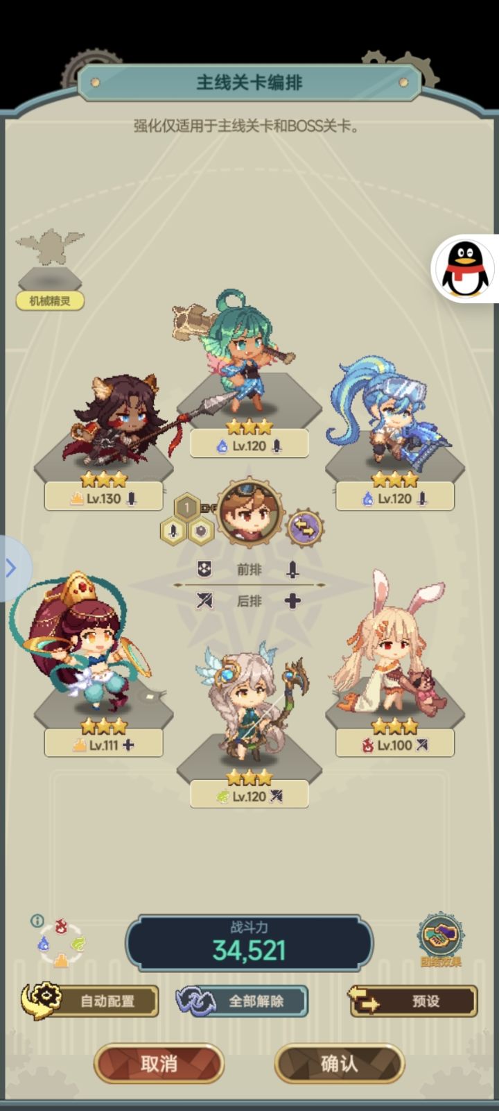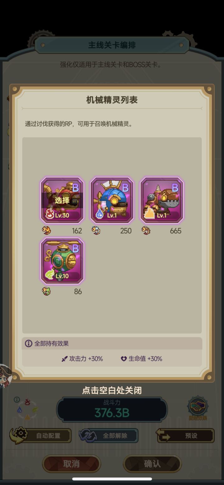 机械精灵目前有四个,对应风火水土四个属性,上阵之后机械精灵的编排加成只会对同属性角色生效,持有加成是全体生效.显而易见当前版本上纯色队伍会大于杂色队,辅助杂色不产生影响.机械精灵的抽取是消耗rp或者钻石以及礼包进行升级,机械精灵等级越高上限加成越高.普通玩家可在抽取到主力队伍机械精灵b或者a级后停止钻石消耗参与讨伐用rp抽取后续所需材料.讨伐的进度需要玩家一击必杀怪物后消耗一颗怪物星,玩家最