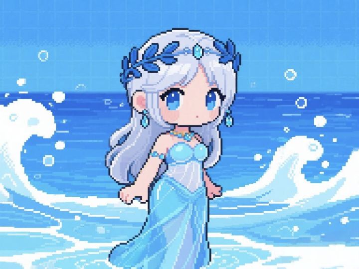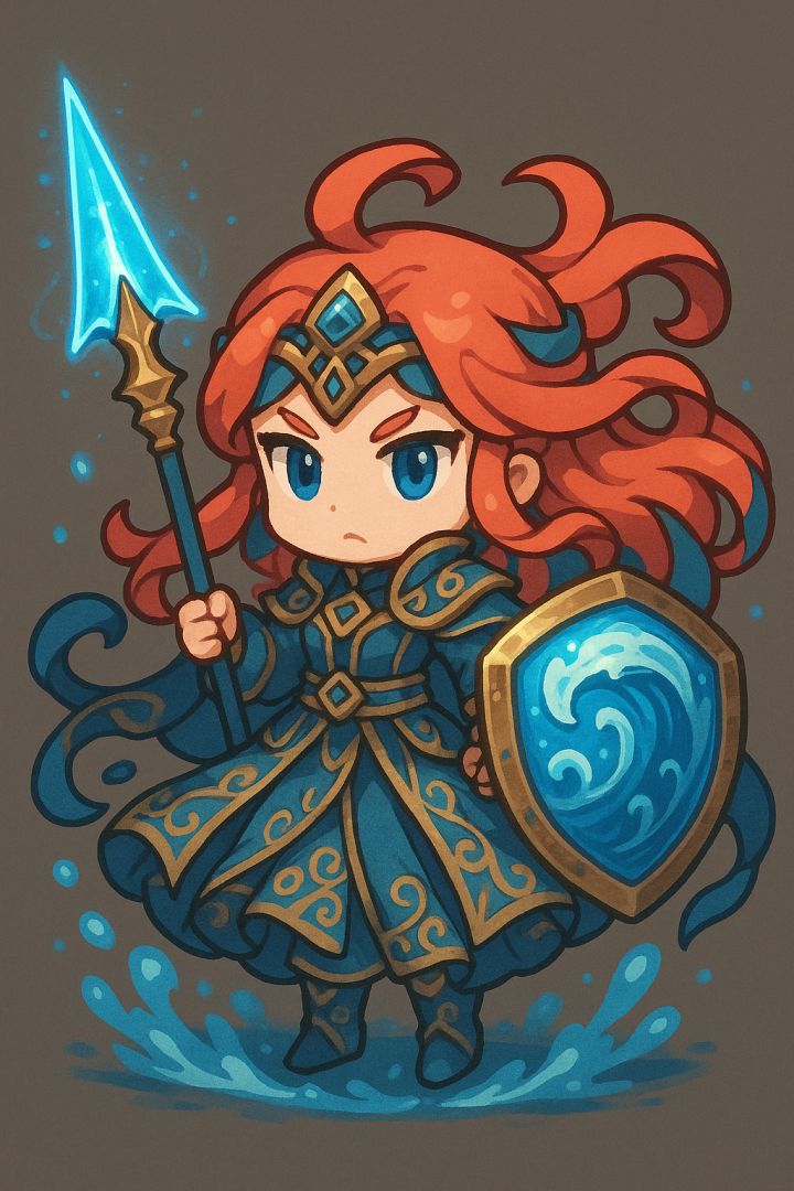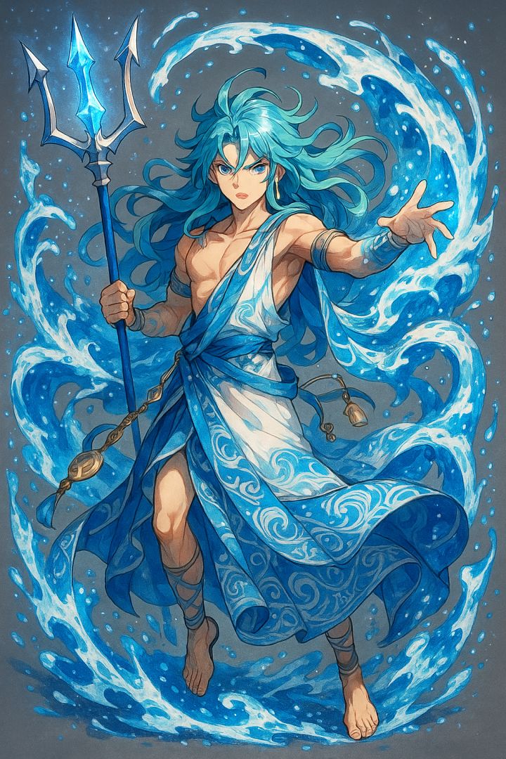 人物名:海韵创意来源:来自海浪的律动与古老神话中的水神形象。他的长发如同翻涌的海潮般流动,衣袍上布满精致的水纹花饰,象征着海洋无尽的力量与深邃的秘密。手中三叉戟闪耀着湛蓝的光芒,不仅是武器,更是掌控潮汐与风暴的神圣象征。环绕在他周身的水流化为护盾与利刃,展现出海洋既能孕育生命,也能摧毁一切的双重面貌