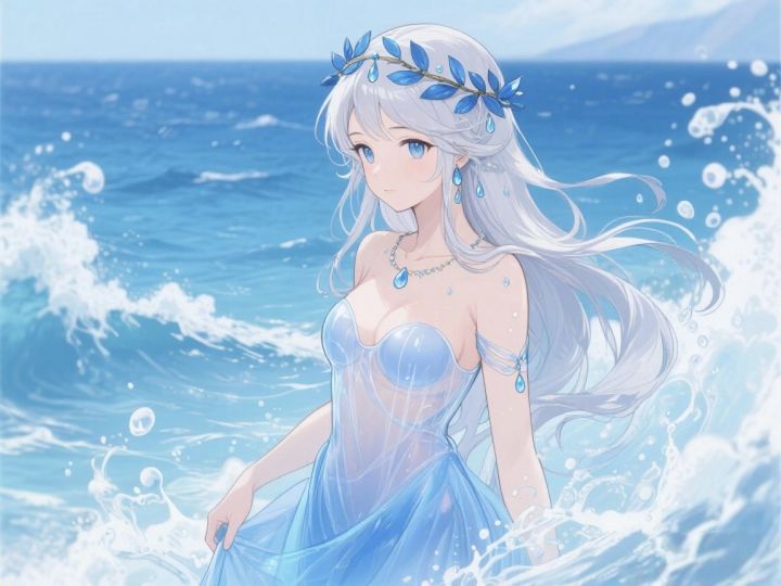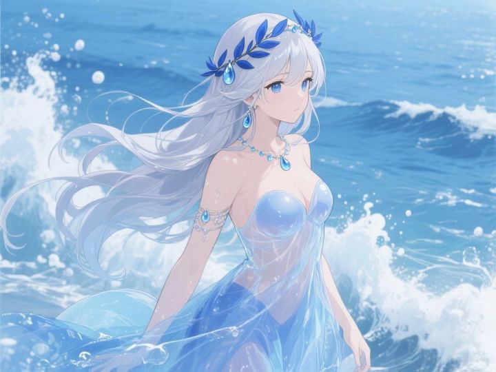①角色名:涅娅②灵感创意来源:灵感源自希腊神话中“涅瑞伊得斯”(海仙女),她们是海神涅柔斯的女儿,象征海洋的温柔与灵动。设计时融入水属性核心——角色可操控海浪与水滴,技能兼具辅助治愈(如召唤水之屏障保护队友)与范围控制(如凝结海水形成束缚漩涡),外形以淡蓝纱质长袍搭配珍珠配饰,长发似流动海水,既保留海仙女的柔美,又契合《飞艇英雄》的战斗设定。③示例图: