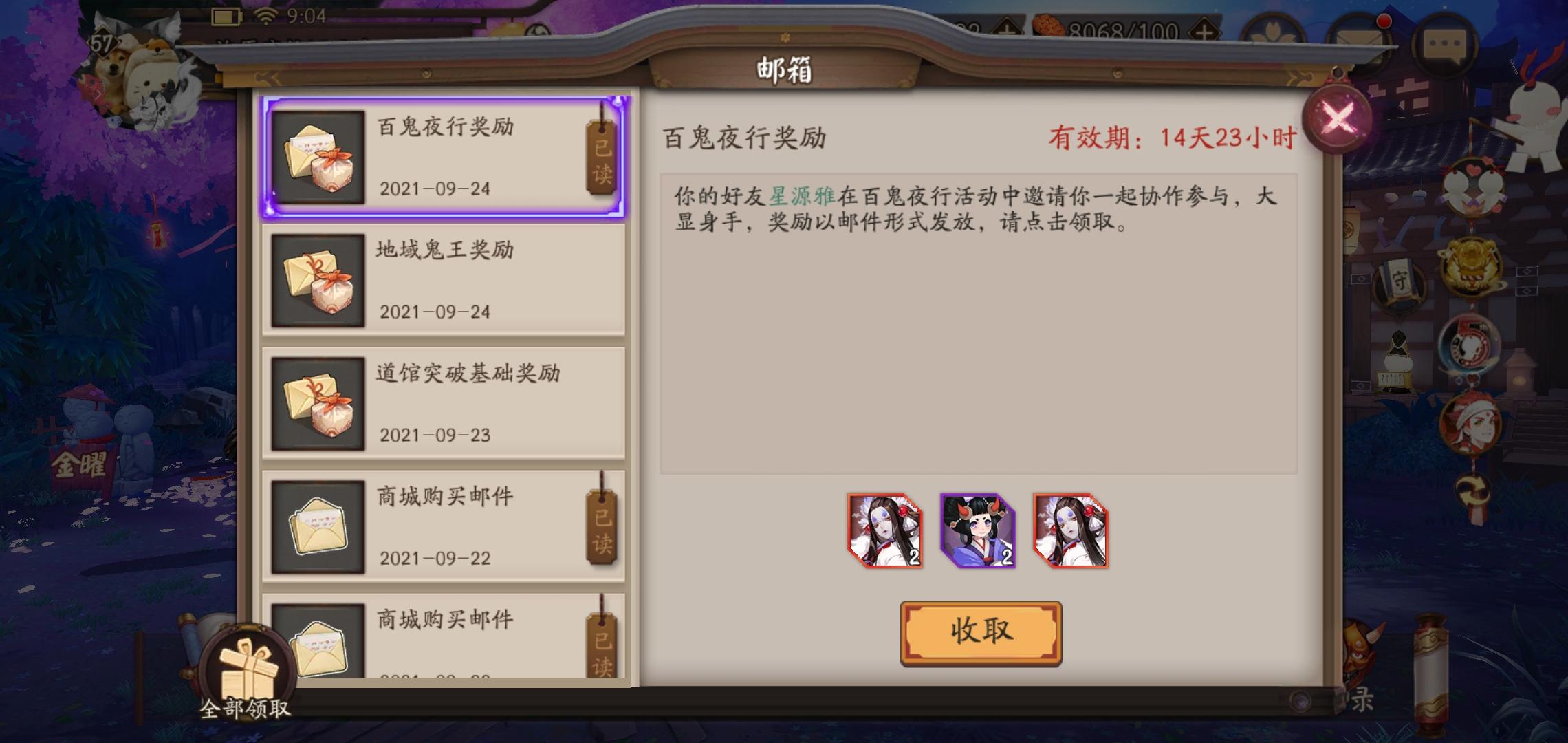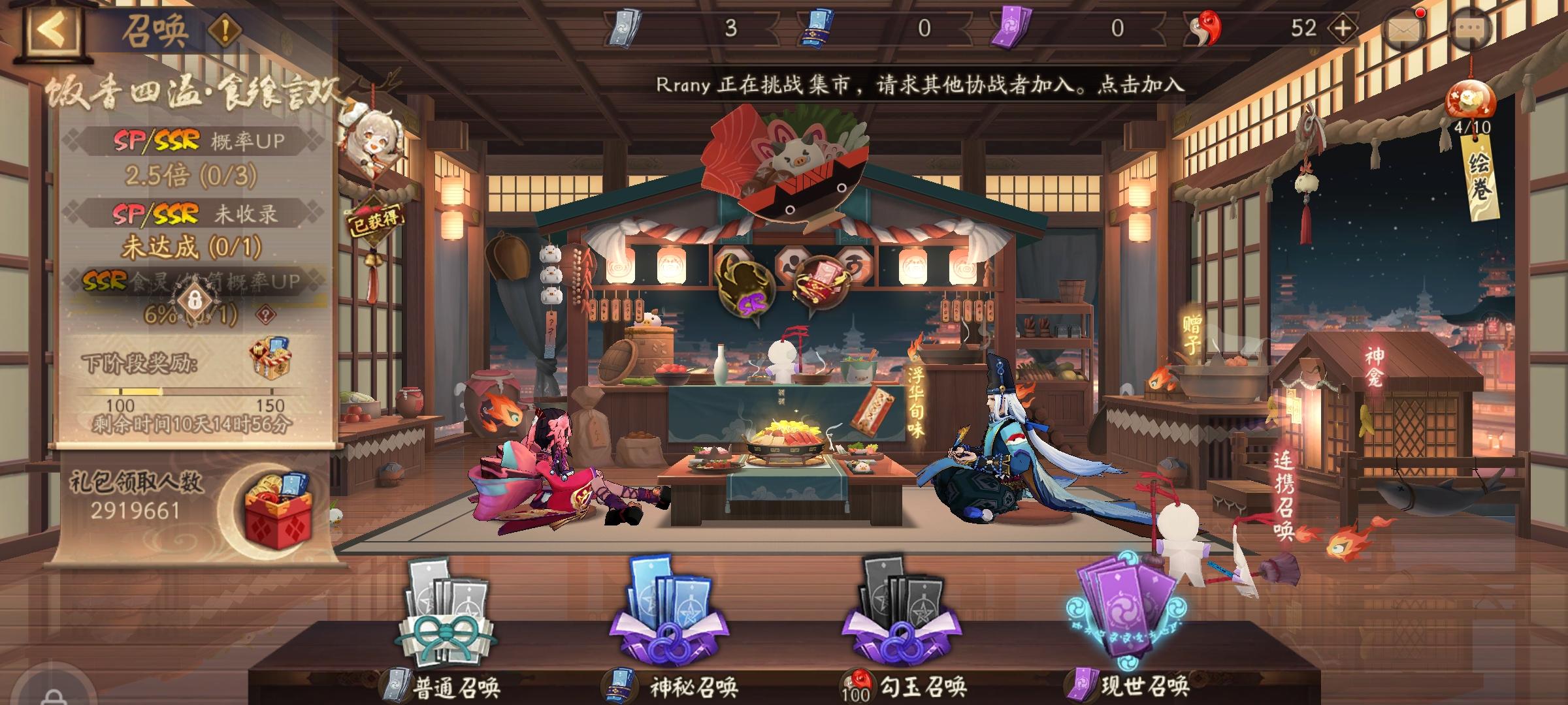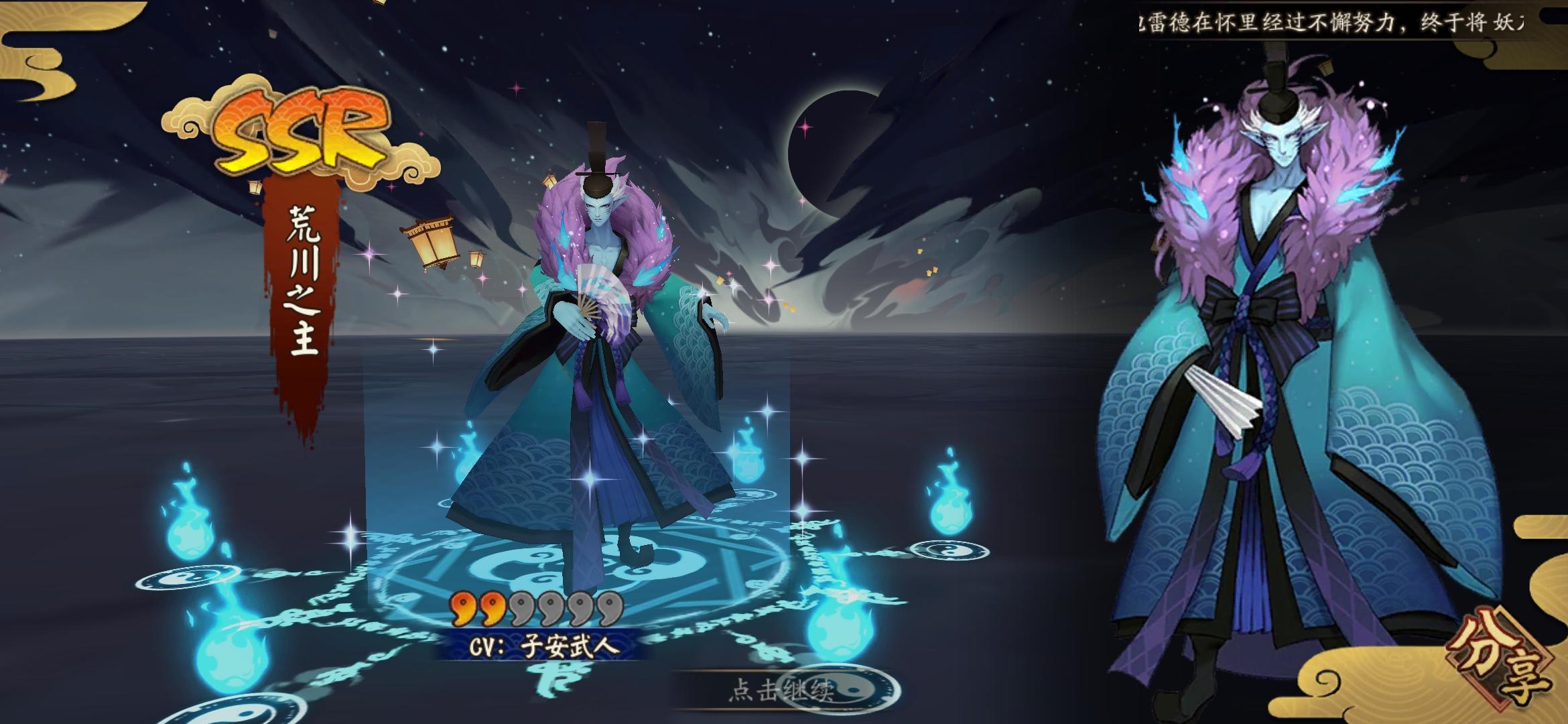 五周年200抽打卡-----脱非入欧???五周年活动上线:骁浪荒川之主(SP)200抽卡获得SP:炼狱茨木童子、绘世花鸟卷、赤影妖刀姬200抽卡获得SSR:面灵气、千姬、一目连、阿修罗、帝释天、花鸟卷100抽卡赠送:烬天玉藻前(SP)五周年活动兑换:御怨般若(SP)分解多余SR兑换:不知火舞
