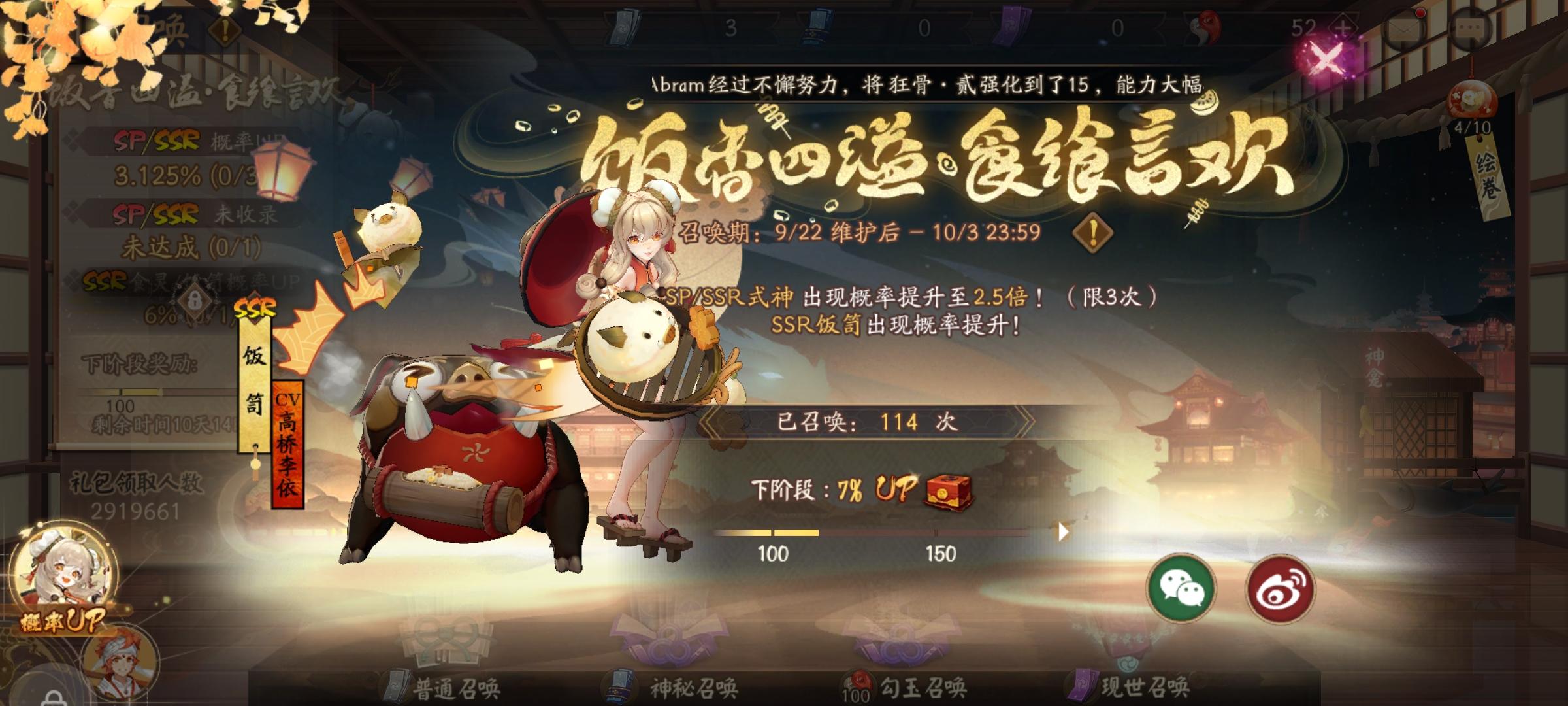 给我逗乐了,114抽一次up都没用,没up的时候出ssr的概率都比这高,分享送妖刀姬,100抽送姑获鸟,商店送一目连,这游戏可真行,退游了,再也不见😅