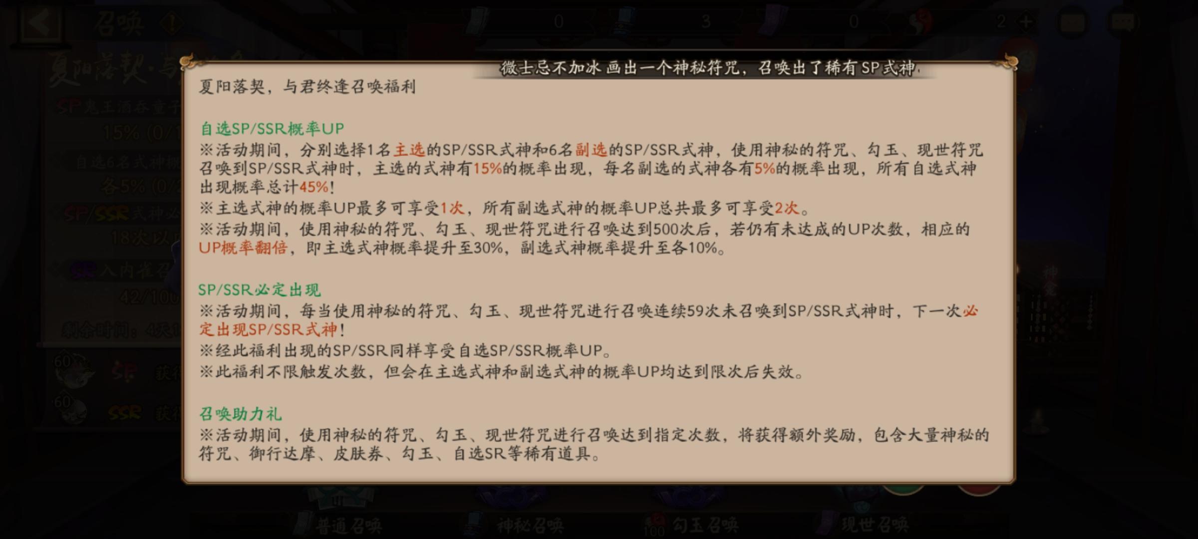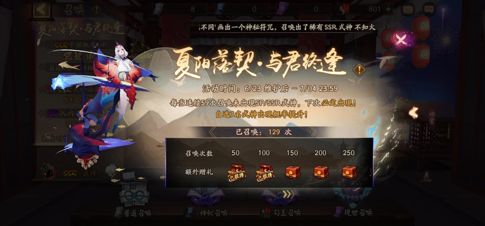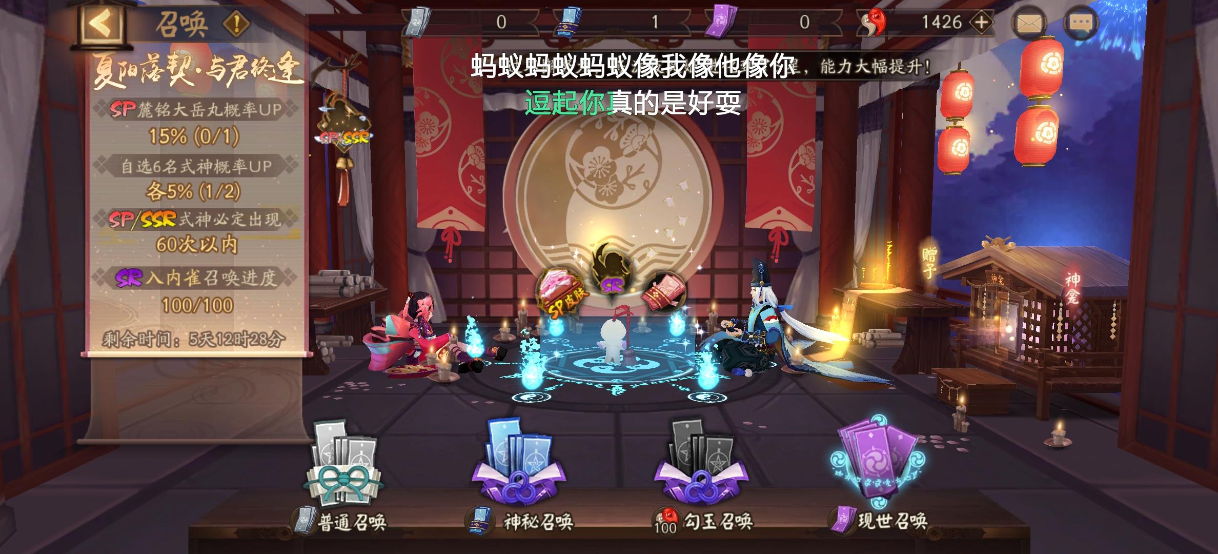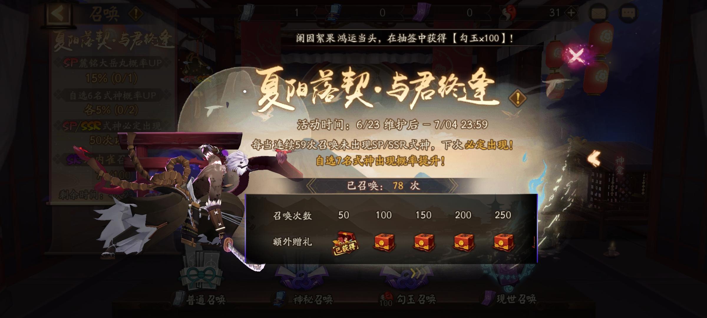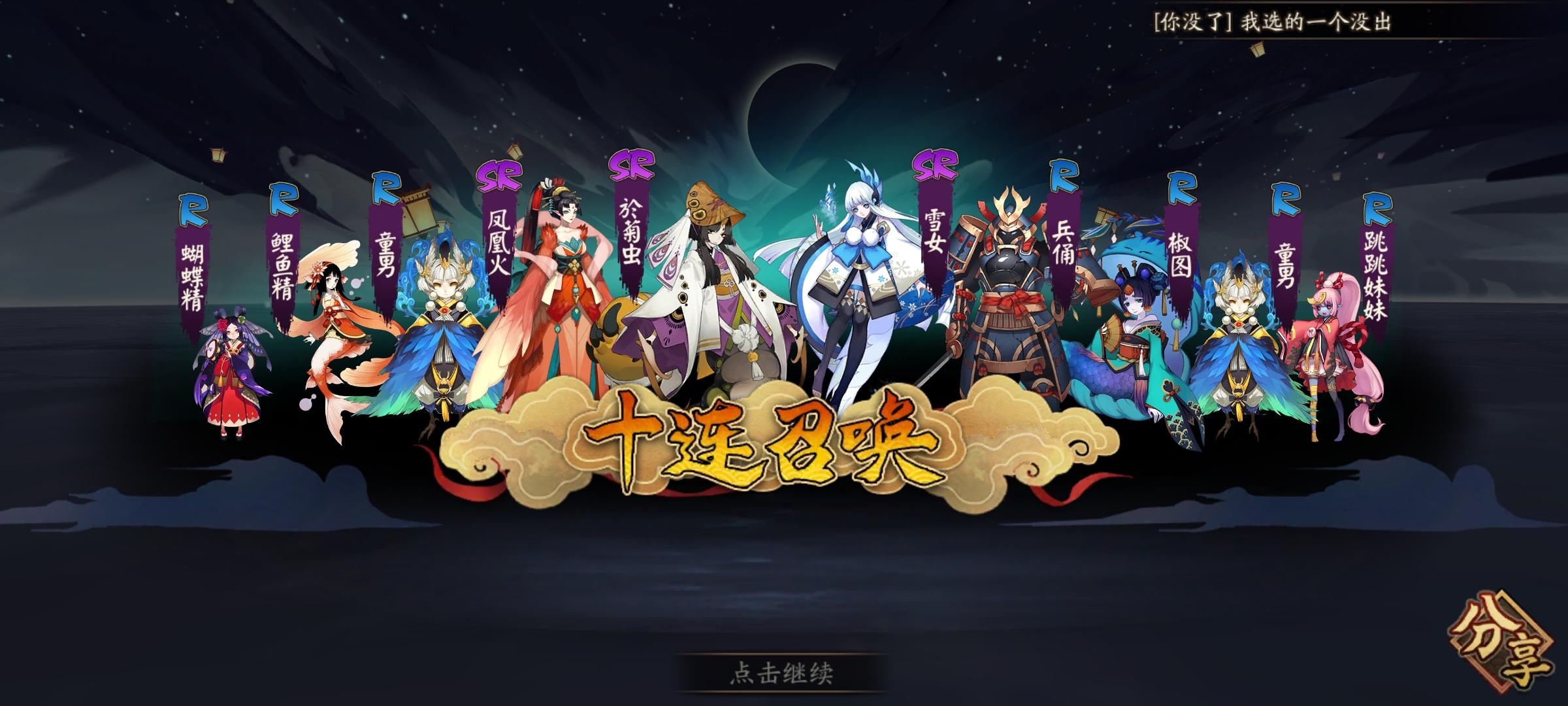 回游大概三星期,上次周年庆没多久退的游,中途回过,但是过几天又删了,本来全图差小鹿辉夜姬,然后回来多了三个,这次up两次保底一个镜子一个千姬,一发十连出了个阿修罗,现在差三个全图了,帝释天碗都没有,小鹿辉夜姬又不想拼,甚至我青行灯都没抽到过(6000御礼换的)所以,为什么灯鹿就送就是不送我呢!现在新区七天就送的小公主我都没有!为什么啊!
