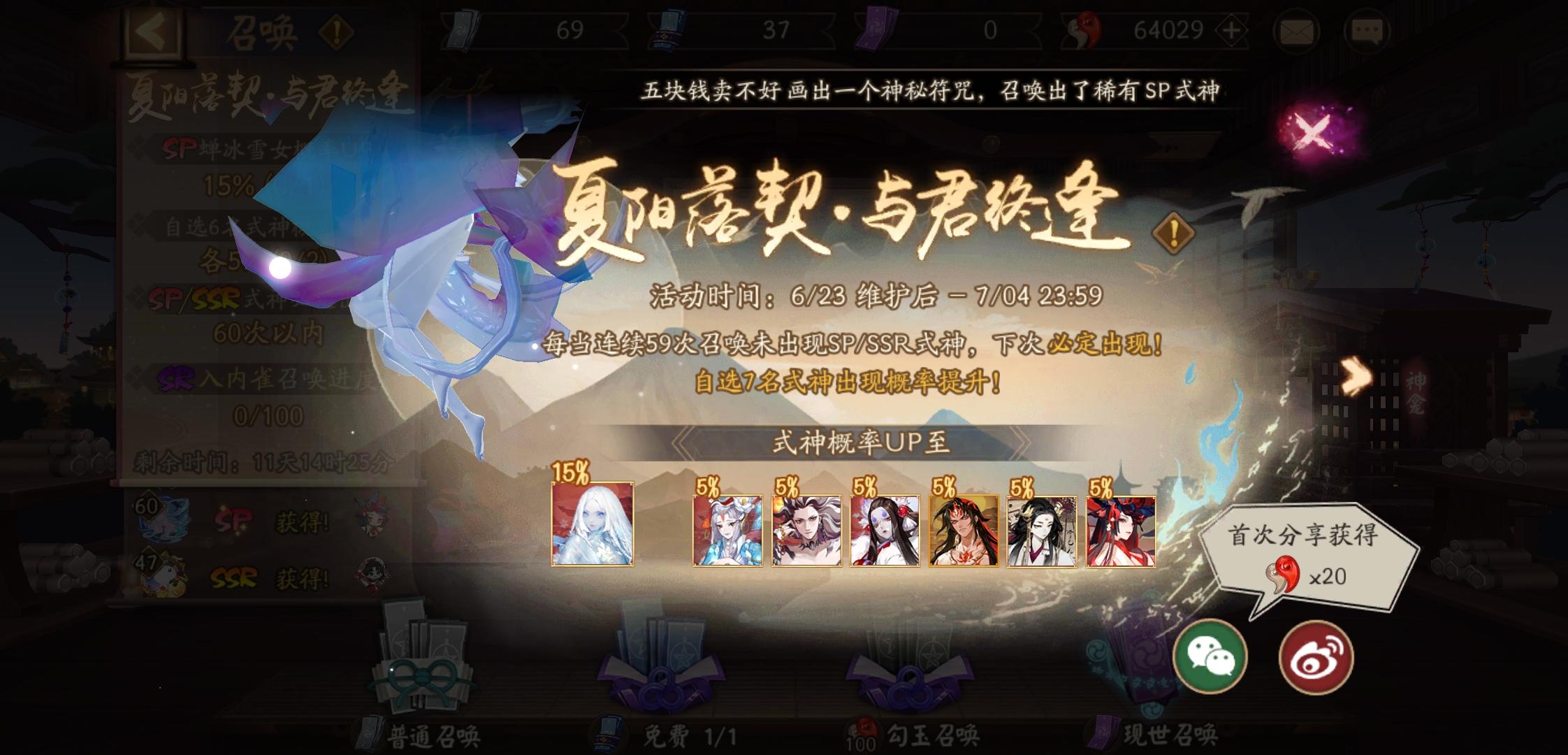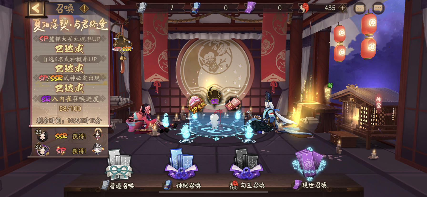 220抽结束全图达成sp雪女(未收录)sp溟花(2)ssr彼岸花(3)ssr鬼切(9)ssr荒总(5)