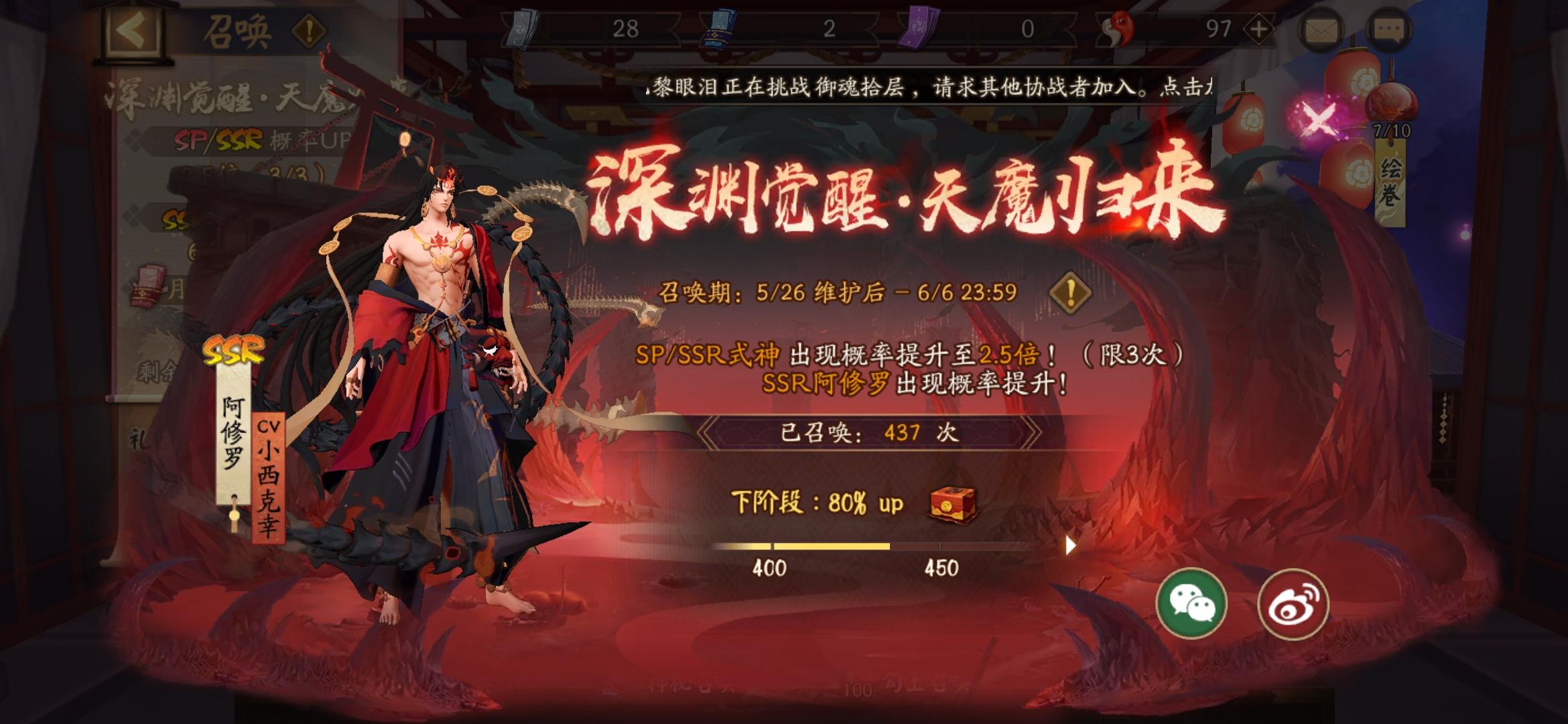 六十的概率了,然后我抽了个现世就他妈离谱,这次活动两个帝释天了。我不配,我真的不配