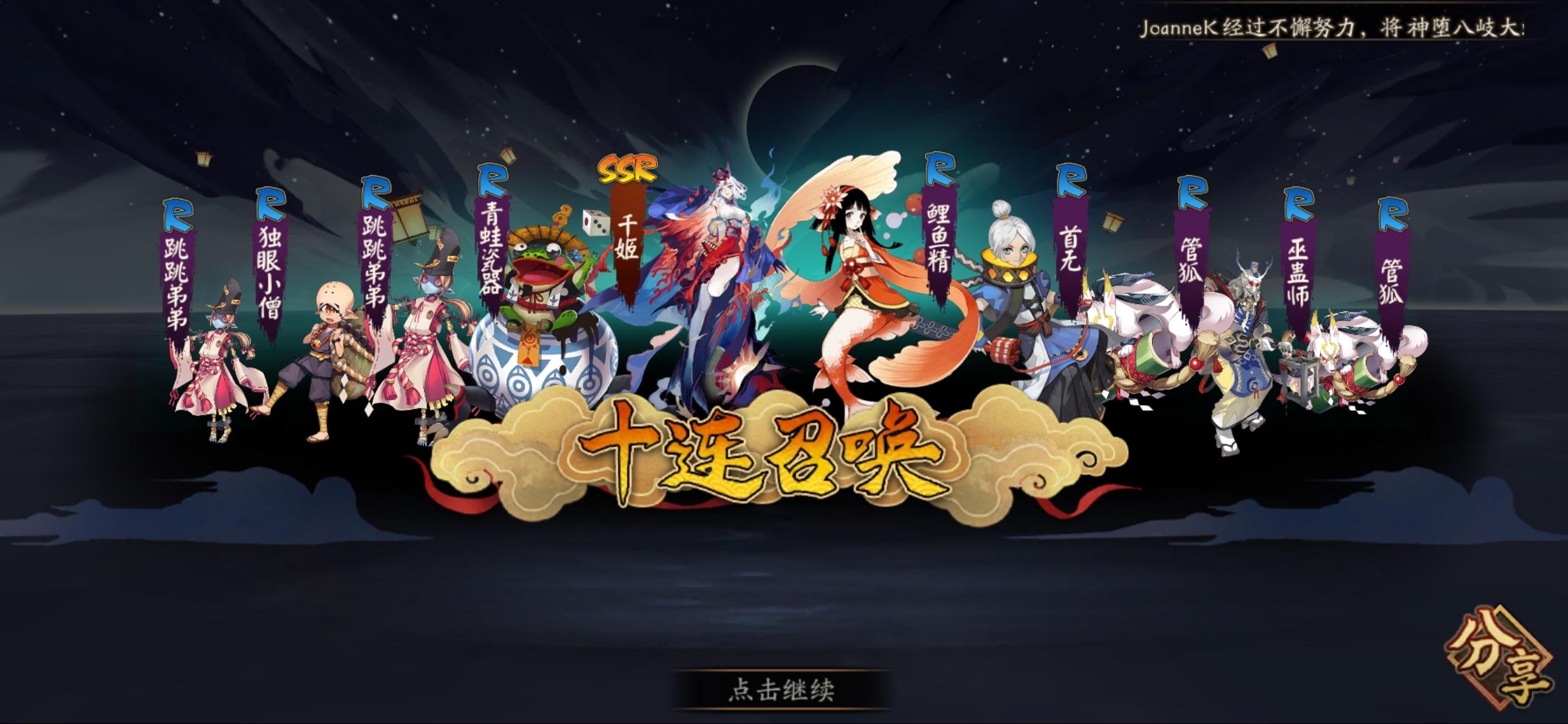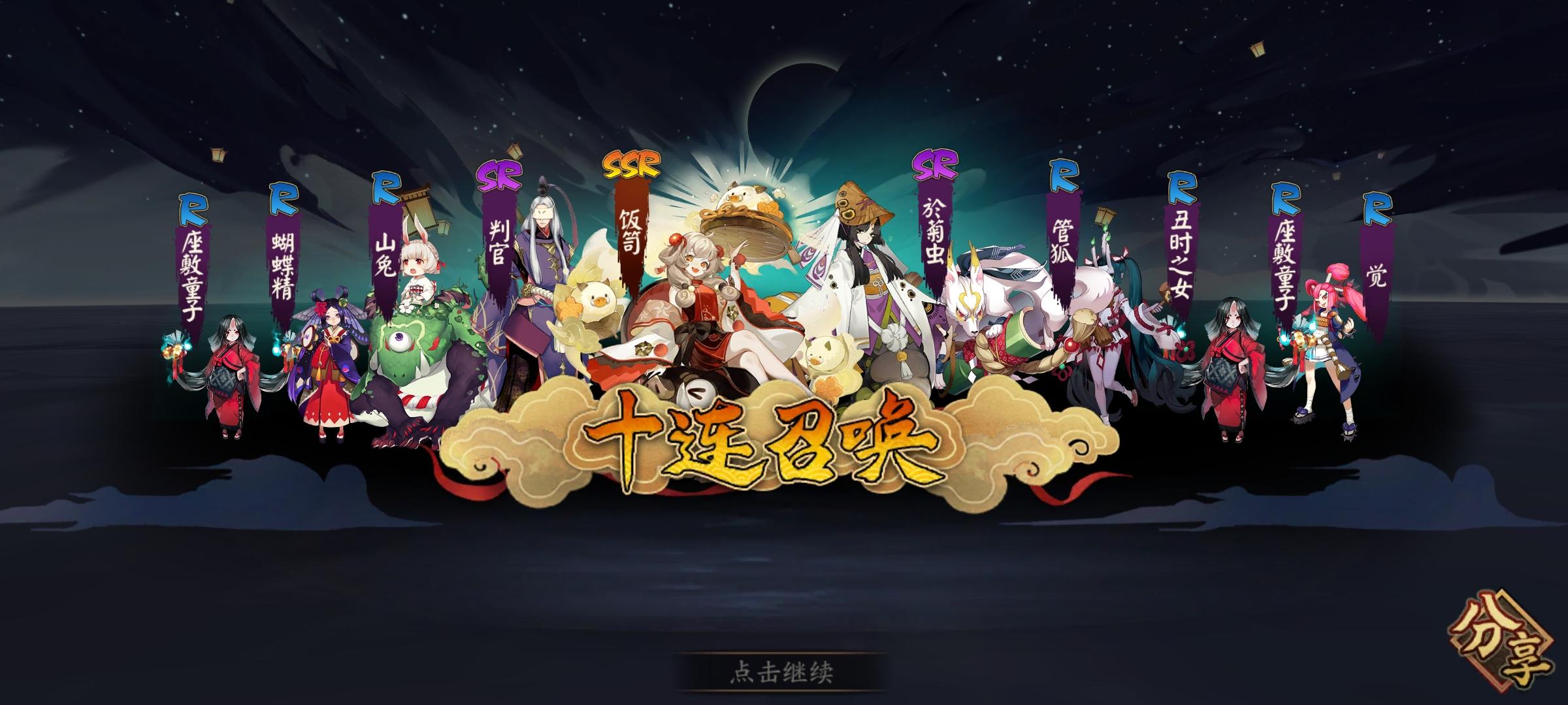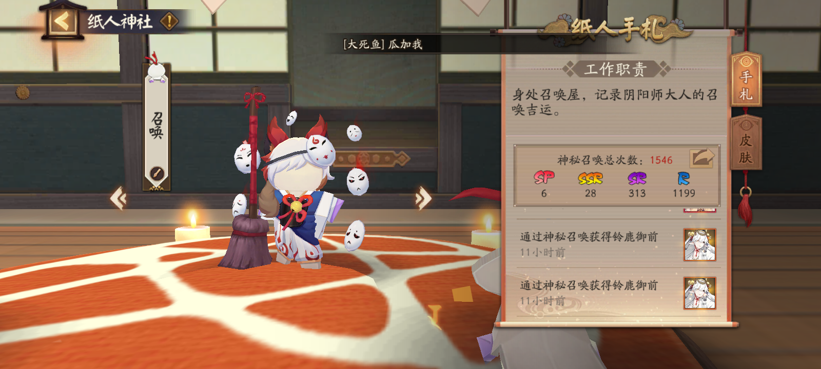 红叶活动本来200抽我就抽到了,因为up用完了2个sp(100抽之间一个SSR),我抽到了450抽为了冲大阴阳,中间就黑了一次出了个烬天(图二)那时已经340没有SSR了。因为没票了,所以等到红叶活动结束,我手里一有票就全抽了,可谓倾家荡产,结果呢,没up,370来了个酒吞,我真的气死了,二觉不来了,然后来断我非酋了,于是把仓库所有酒吞都返了。那段时间佛系了,想着无所谓啦,大阴阳哪有那么容易的。(