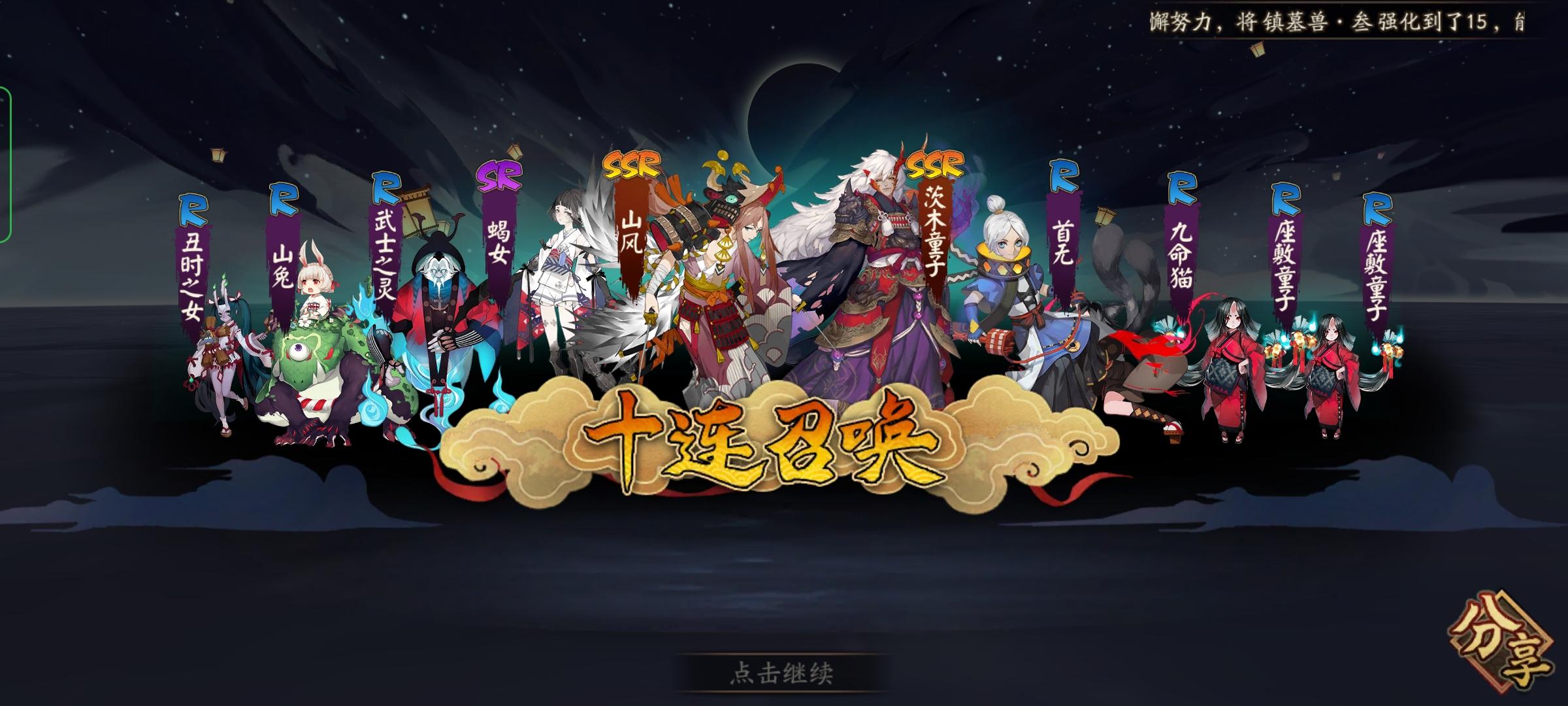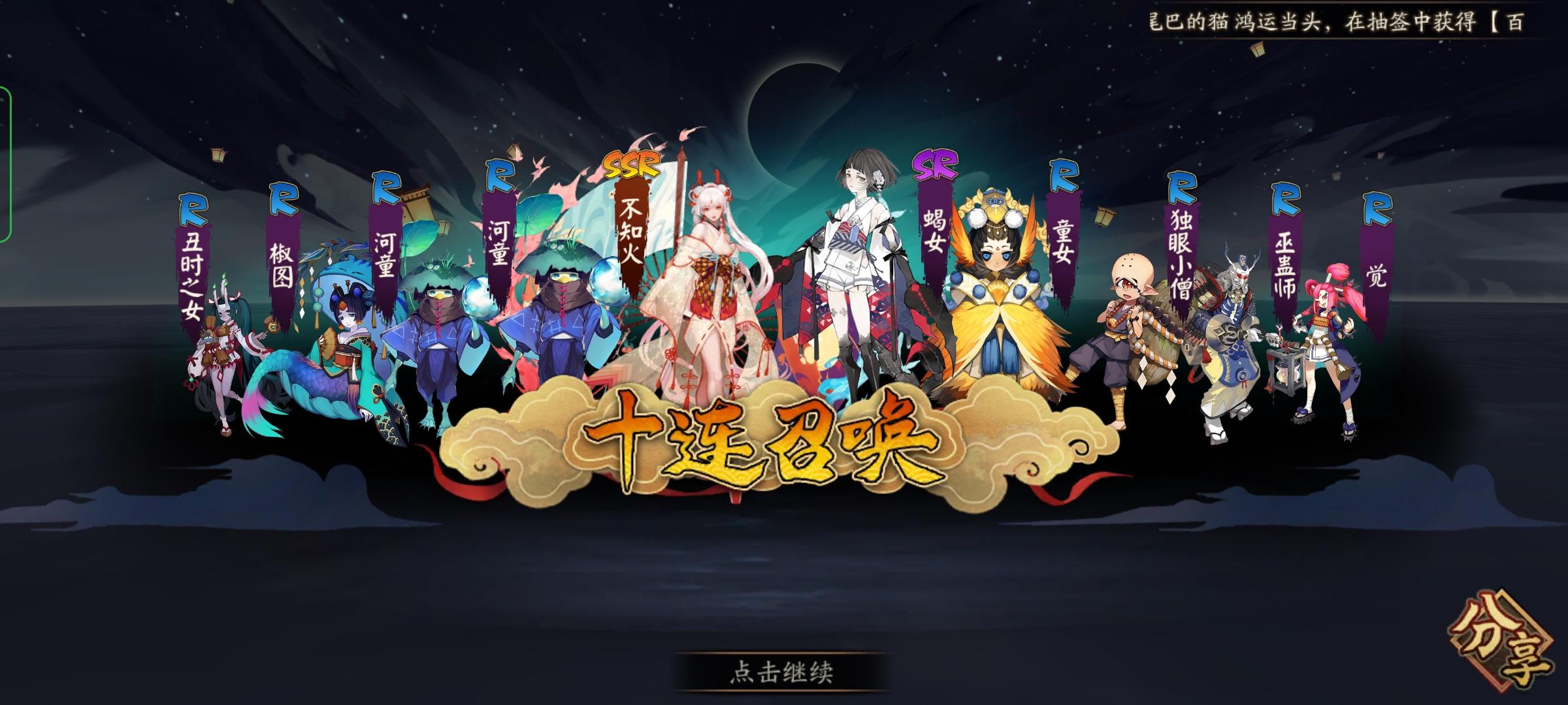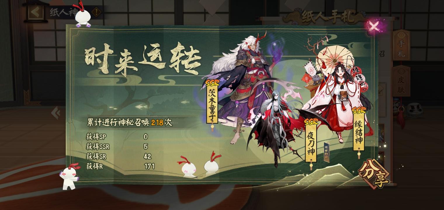 这次活动第一天签到大吉我就马上抽了120张蓝票,新收录了缘结神、鬼童丸、云外镜、白藏主、祢豆子,在活动商店兑到茨木童子之后几天好像欧气被吸干了一样,想趁着最后几个小时再氪个花合战礼包还忘了手势密码又要等三天密码重置,终于让我爬秘闻塔给一票一票给抽出来了