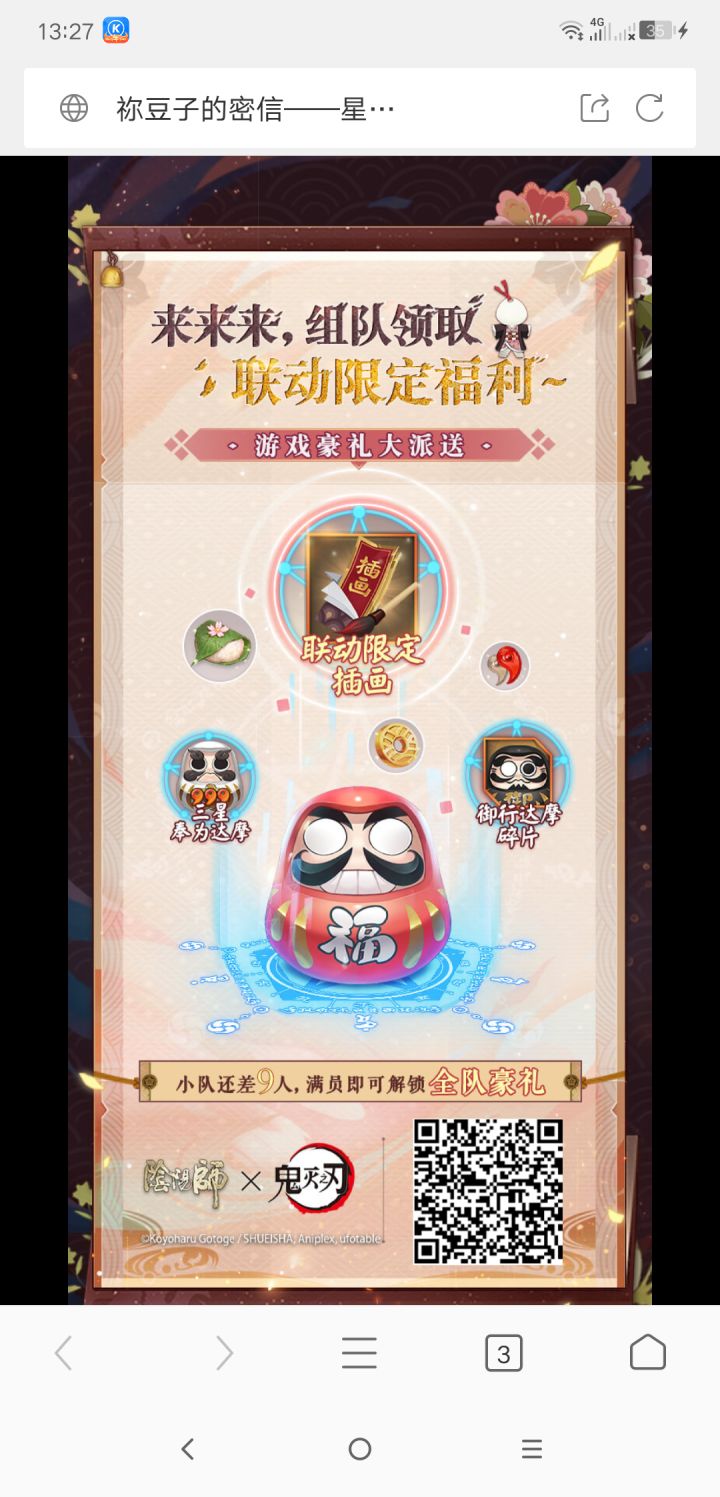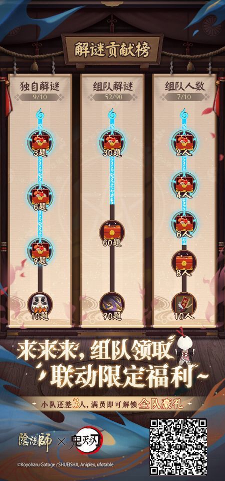 星阵闪耀,符印翻飞,跨时空的密信考验来临,从箱中苏醒的少女随哥哥应邀而来,唯有集结大家的力量,才能破解谜团,完成真正的试炼!↓↓↓△《阴阳师》xTV动画《鬼灭之刃》星阵解谜开启,即时起-2月7日维护前,大人们可点击下方入口参与活动,与炭治郎和祢豆子一起试炼~ (=゚ω゚)ノ※大人们可邀请好友加入解谜队伍,根据组队人数可解锁御行达摩碎片、联动限定插画等多重奖励!※最终奖励将按照活动期间内,大