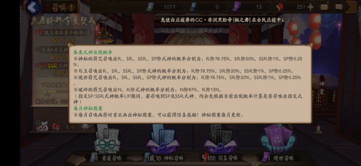 这次活动到底是不是骗票大家心里大概都有数了。鉴于跟我杠的人太多,就杠呗。首先,第一时间我是没仔细看说明的,就是凭抽卡的手感隐约感到了不太对劲。被怼了之后仔细看了一下下,这活动玩六六六啊!首先,活动先让你看到自选概率up,然后强调一下60抽保底必出。一般不太过脑子的感觉都是啊福利!但是仔细琢磨一下呢?以鬼吞为例。正常情况下无活动,抽到sp概率为基础的0.25%,假设所有同稀有度式神概率均等 那么其中
